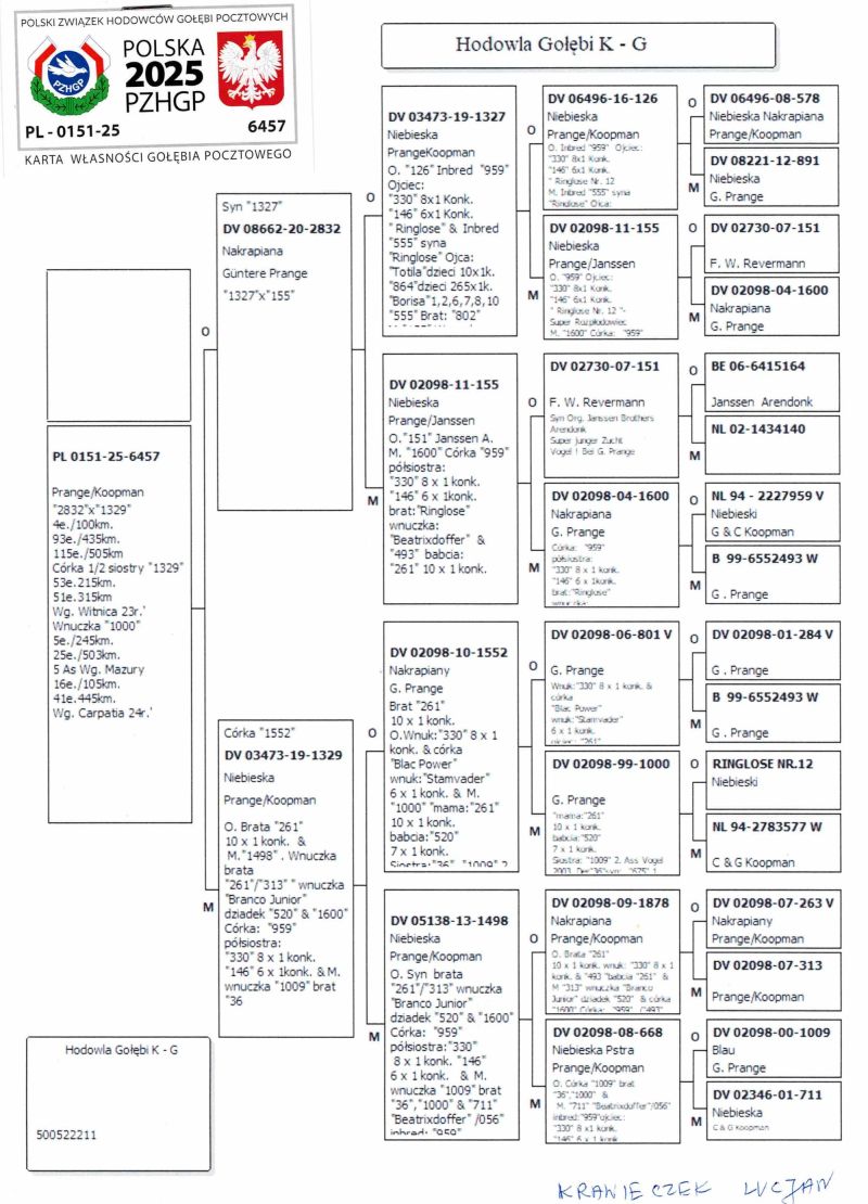 Opis: Uczestnik WG Warmia 2025, sezon VIII. Loty z kierunku północny wschód, Litwa. 93 z Finału, 55 AS, 115 z Extra Finału. Szczegóły pochodzenia w rodowodzie.