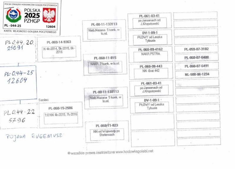Opis: Uczestnik WG Warmia 2025, sezon VIII. Loty z kierunku północny wschód, Litwa. 90 z Finału, 244 AS, 82 z Extra Finału. Szczegóły pochodzenia w rodowodzie.