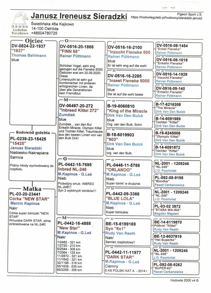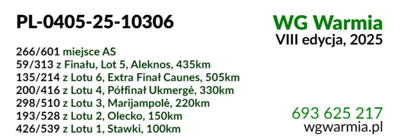 Opis: Uczestnik WG Warmia 2025, sezon VIII. Loty z kierunku północny wschód, Litwa. 59 z Finału, 266 AS, 135 z Extra Finału. Szczegóły pochodzenia w rodowodzie.