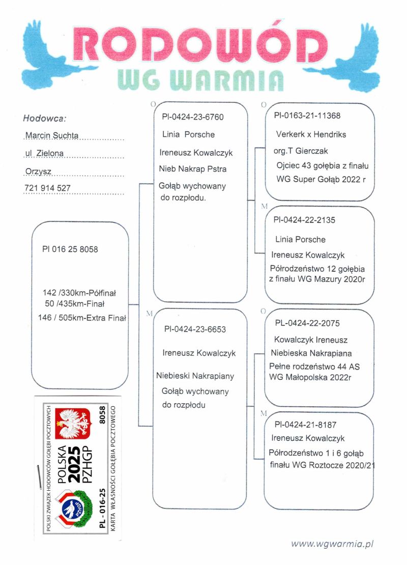 Opis: Uczestnik WG Warmia 2025, sezon VIII. Loty z kierunku północny wschód, Litwa. 50 z Finału, 191 AS, 146 z Extra Finału. Szczegóły pochodzenia w rodowodzie.