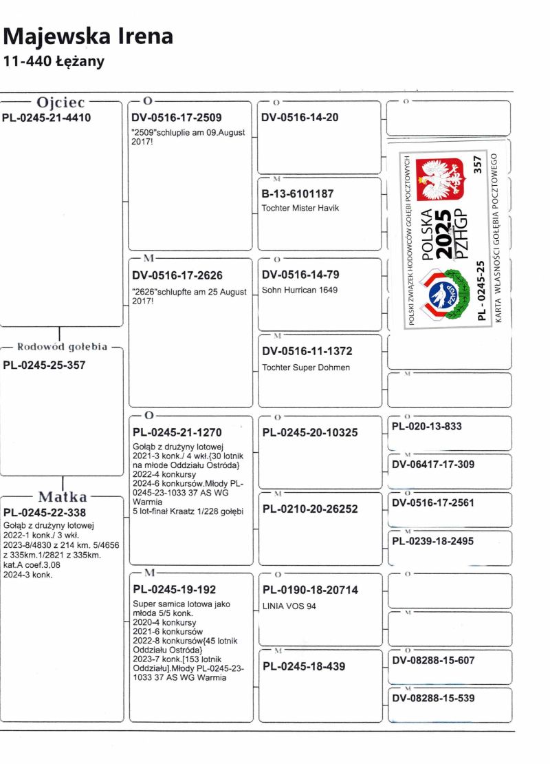 Opis: Uczestnik WG Warmia 2025, sezon VIII. Loty z kierunku północny wschód, Litwa. 25 z Finału, 65 AS, 62 z Extra Finału. Szczegóły pochodzenia w rodowodzie.