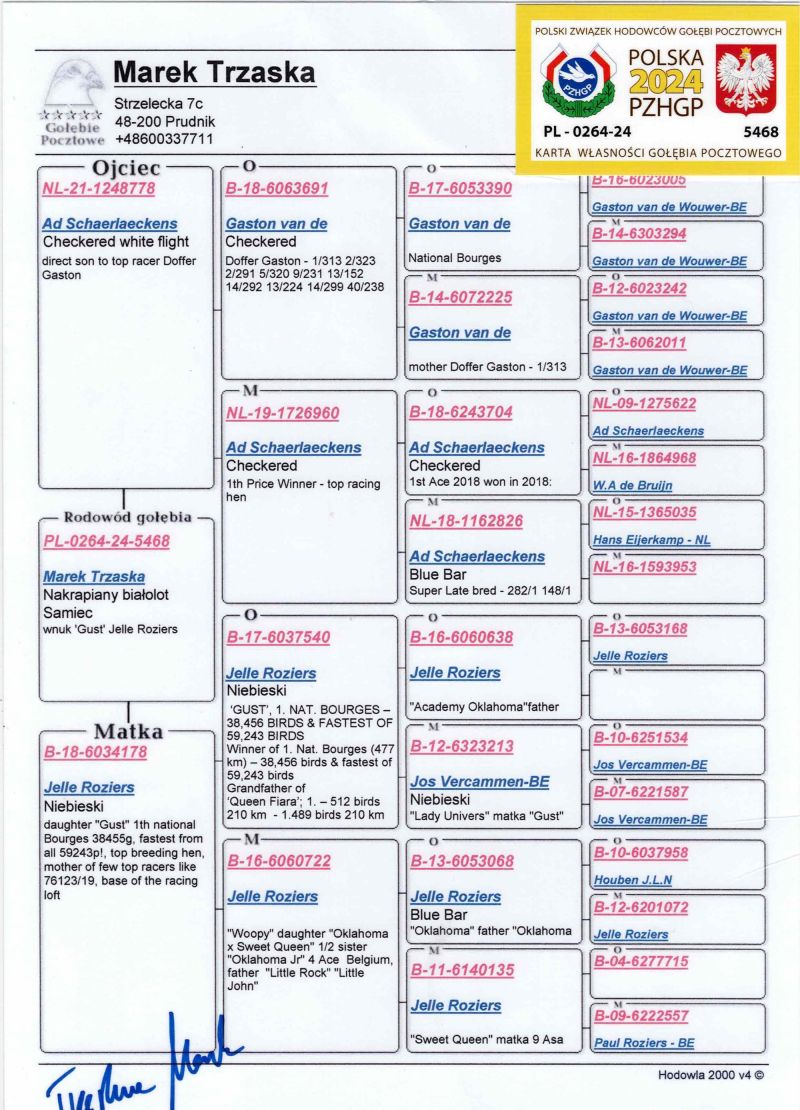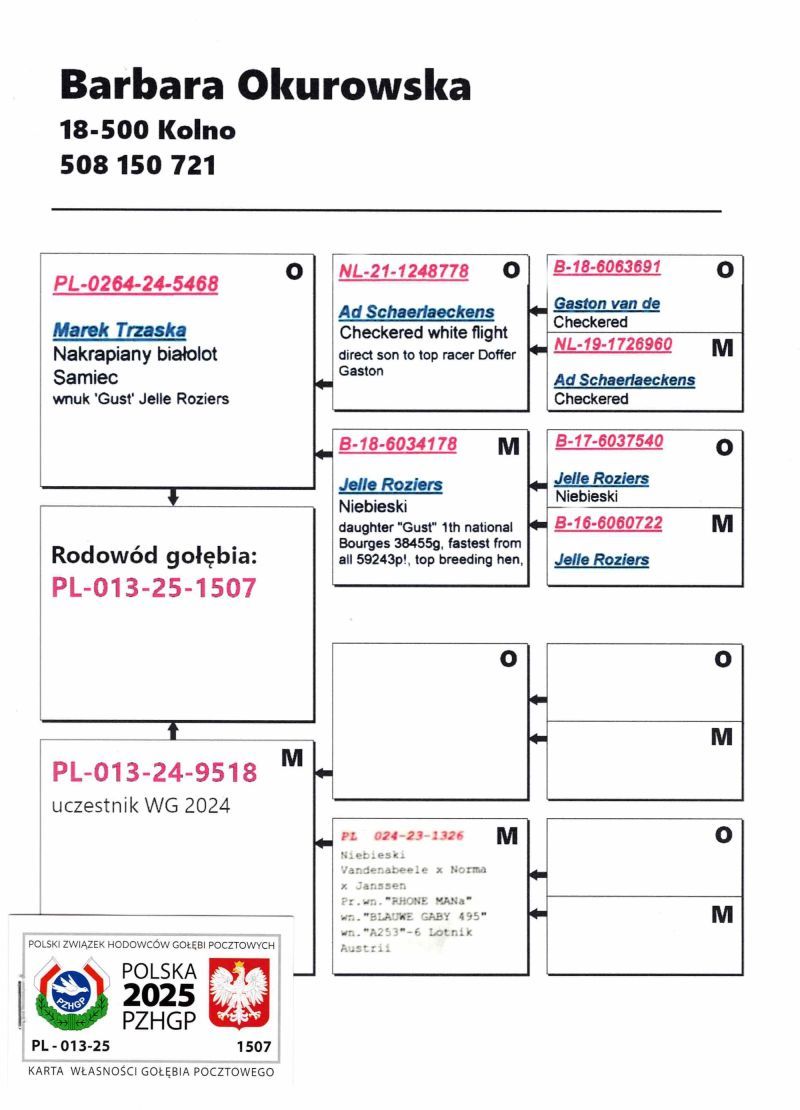 Opis: Uczestnik WG Warmia 2025, sezon VIII. Loty z kierunku północny wschód, Litwa. 22 z Finału, 105 AS, 126 z Extra Finału. Szczegóły pochodzenia w rodowodzie.