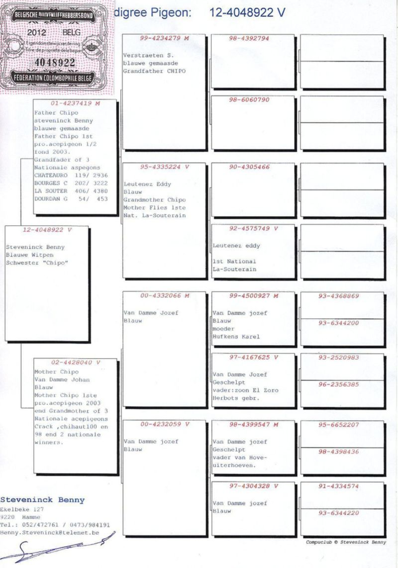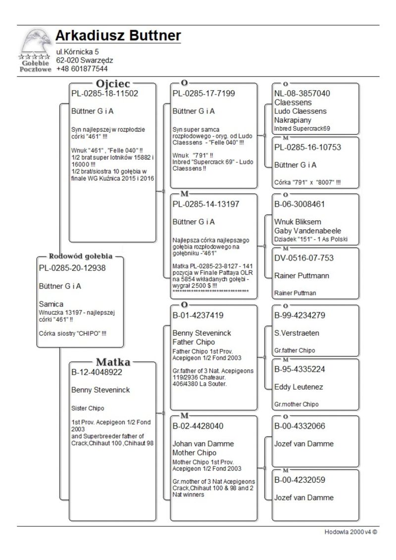 Został też 4 Asem Polski kat krótki dystans 2024 z coeff 17 z groszem z 5 lotów do kat A właśnie dla Kolegi Jacka Orszulika !!!oraz ojciec , dziadek i pradziadek wielu wybitnych gołębi rozpłodowych i lotowych na wielu gołębnikach !!"Felle 040" ojciec m.in 8755 , który dla Kol . Krzyśka Kusia wylatał 4 wynik w Polsce w kat olimpijskie E i był gołębiem rezerwowym na olimpiadę. Jest też pradziadkiem PL-0122-22-2219 - w 2 sezony na 21 wkładań 20 konkursów - kat A coeff 9,08 a z dwóch lat do wystaw kat A-74,86 , kat B-65,94 a kat D-72,20