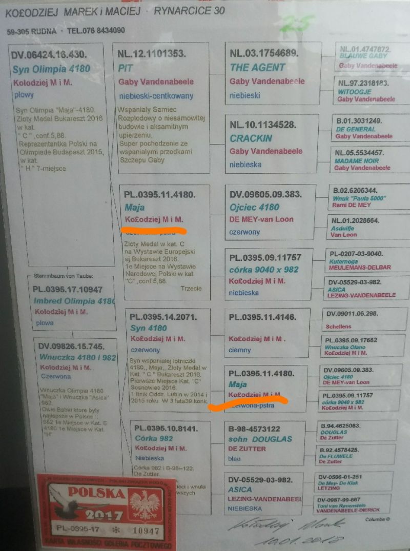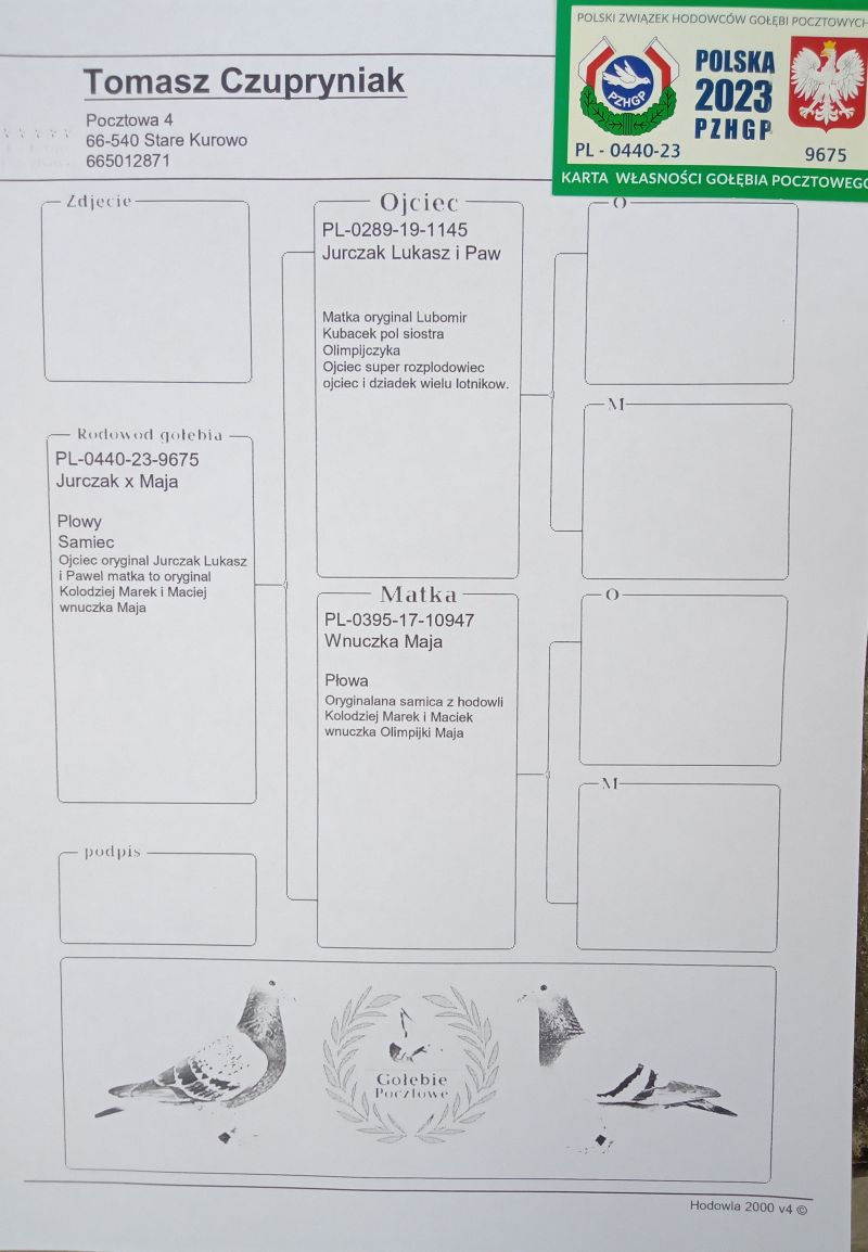 Opis: Sprzedam pięknego samca 23r po oryginał Kołodziej Marek i Maciej wnuczka Olimpijki Maja i po samcu Jurczak Łukasz i Paweł+ samica do niego gratis Pl-083-17-6069 lotowana od 100-800km brak karty bo mi gdzieś zaginęła polecam do dalszej hodowli.wysylka 150zl