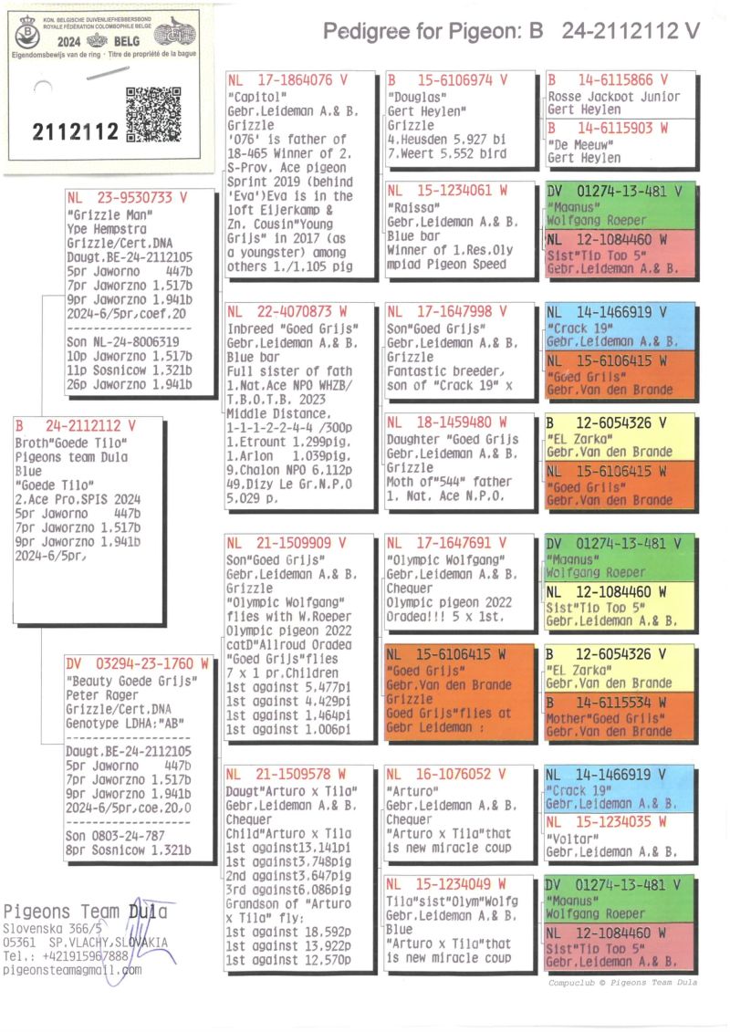 PL-0155-25-701 - 100% Leideman - Linia Topowych gołębi braci Leideman - Goed Grijs, Olympic Wolfgang, Arturo x Tila