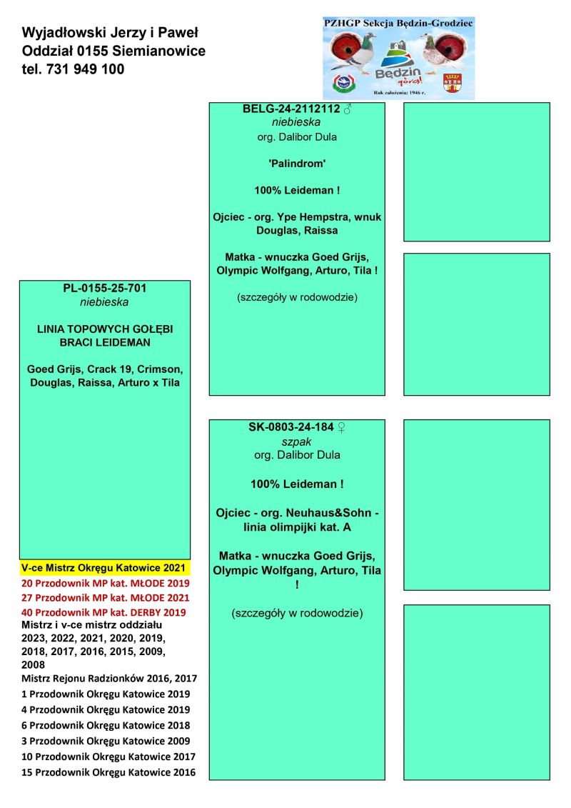 Opis: Młode po najlepszych parach rozpłodowych oraz z gołębi lotowych, których rodzeństwo i rodzice nieprzerwanie w latach 2016-2025 zdobyło w sumie 9 lat z rzędu Mistrzostwo Oddziału w lotach gołębi młodych, kilkukrotnie Mistrzostwo oraz v-ce mistrzostwo rejonu, oraz wiele czołowych pozycji we współzawodnictwie Okręgu Katowice oraz MP co widać w zamieszczonych załącznikach. Wszystkie młode zaszczepione szczepionką RP Vacc. Możliwość wysyłki na warunkach kurierów świadczących usługi przewozu gołębi po wcześniejszym ustaleniu szczegółów (koszt około 150 zł za paczkę do 4 szt.) oraz odbiór osobisty. Telefon kontaktowy 731 949 100. Prawdopodobnie samiec.