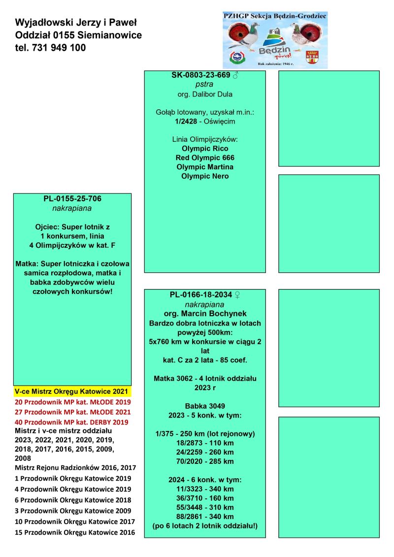 Opis: Młode po najlepszych parach rozpłodowych oraz z gołębi lotowych, których rodzeństwo i rodzice nieprzerwanie w latach 2016-2025 zdobyło w sumie 9 lat z rzędu Mistrzostwo Oddziału w lotach gołębi młodych, kilkukrotnie Mistrzostwo oraz v-ce mistrzostwo rejonu, oraz wiele czołowych pozycji we współzawodnictwie Okręgu Katowice oraz MP co widać w zamieszczonych załącznikach. Wszystkie młode zaszczepione szczepionką RP Vacc. Możliwość wysyłki na warunkach kurierów świadczących usługi przewozu gołębi po wcześniejszym ustaleniu szczegółów (koszt około 150 zł za paczkę do 4 szt.) oraz odbiór osobisty. Telefon kontaktowy 731 949 100.