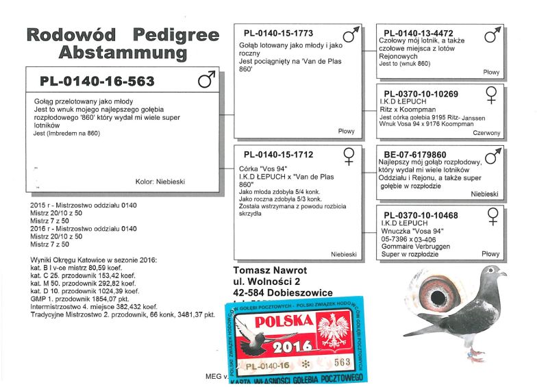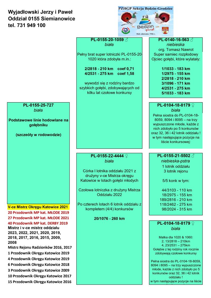 Opis: Młode po najlepszych parach rozpłodowych oraz z gołębi lotowych, których rodzeństwo i rodzice nieprzerwanie w latach 2016-2025 zdobyło w sumie 9 lat z rzędu Mistrzostwo Oddziału w lotach gołębi młodych, kilkukrotnie Mistrzostwo oraz v-ce mistrzostwo rejonu, oraz wiele czołowych pozycji we współzawodnictwie Okręgu Katowice oraz MP co widać w zamieszczonych załącznikach. Wszystkie młode zaszczepione szczepionką RP Vacc. Możliwość wysyłki na warunkach kurierów świadczących usługi przewozu gołębi po wcześniejszym ustaleniu szczegółów (koszt około 150 zł za paczkę do 4 szt.) oraz odbiór osobisty. Telefon kontaktowy 731 949 100.