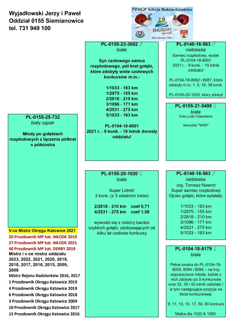 Opis: Młode po najlepszych parach rozpłodowych oraz z gołębi lotowych, których rodzeństwo i rodzice nieprzerwanie w latach 2016-2025 zdobyło w sumie 9 lat z rzędu Mistrzostwo Oddziału w lotach gołębi młodych, kilkukrotnie Mistrzostwo oraz v-ce mistrzostwo rejonu, oraz wiele czołowych pozycji we współzawodnictwie Okręgu Katowice oraz MP co widać w zamieszczonych załącznikach. Wszystkie młode zaszczepione szczepionką RP Vacc. Możliwość wysyłki na warunkach kurierów świadczących usługi przewozu gołębi po wcześniejszym ustaleniu szczegółów (koszt około 150 zł za paczkę do 4 szt.) oraz odbiór osobisty. Telefon kontaktowy 731 949 100. Gołębie z linii Ludo Cleassens bardzo dobrze poradziły sobie w lotach gołębi młodych 2025 przyczyniając się do zdobycia 9 raz z rzędu Mistrzostwa Oddziału. Z 8 szt. białych zgłoszonych do lotu po lotach zostało wszystkie 8 szt. (pomimo ciężkiego sezonu i sporych strat) w tym bardzo dobrze pokazując się np. z lotu nr 6 na 345 km gdzie wszystkie białe z tej linii zdobyły konkursy !