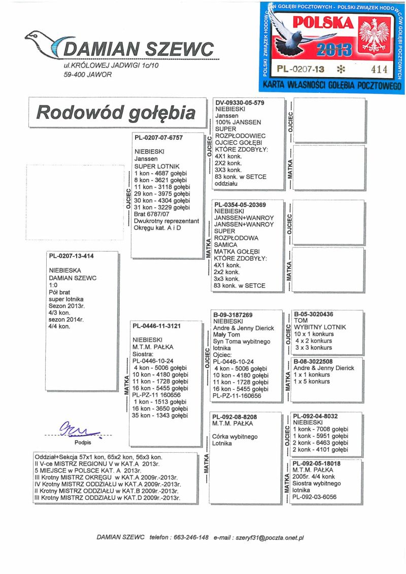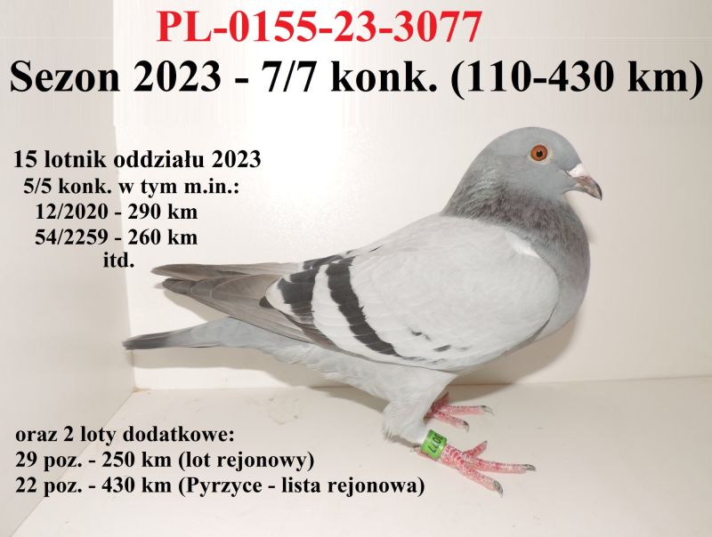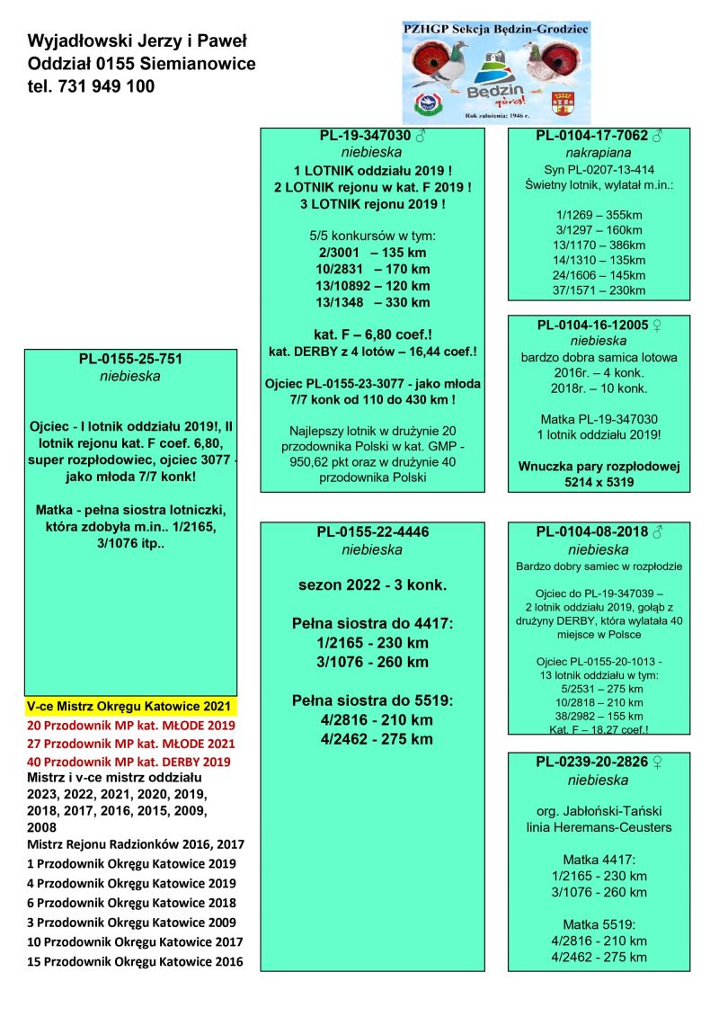 Opis: Młode po najlepszych parach rozpłodowych oraz z gołębi lotowych, których rodzeństwo i rodzice nieprzerwanie w latach 2016-2025 zdobyło w sumie 9 lat z rzędu Mistrzostwo Oddziału w lotach gołębi młodych, kilkukrotnie Mistrzostwo oraz v-ce mistrzostwo rejonu, oraz wiele czołowych pozycji we współzawodnictwie Okręgu Katowice oraz MP co widać w zamieszczonych załącznikach. Wszystkie młode zaszczepione szczepionką RP Vacc. Możliwość wysyłki na warunkach kurierów świadczących usługi przewozu gołębi po wcześniejszym ustaleniu szczegółów (koszt około 150 zł za paczkę do 4 szt.) oraz odbiór osobisty. Telefon kontaktowy 731 949 100.
