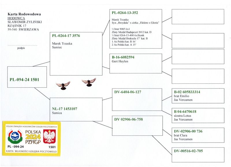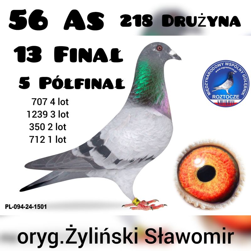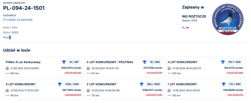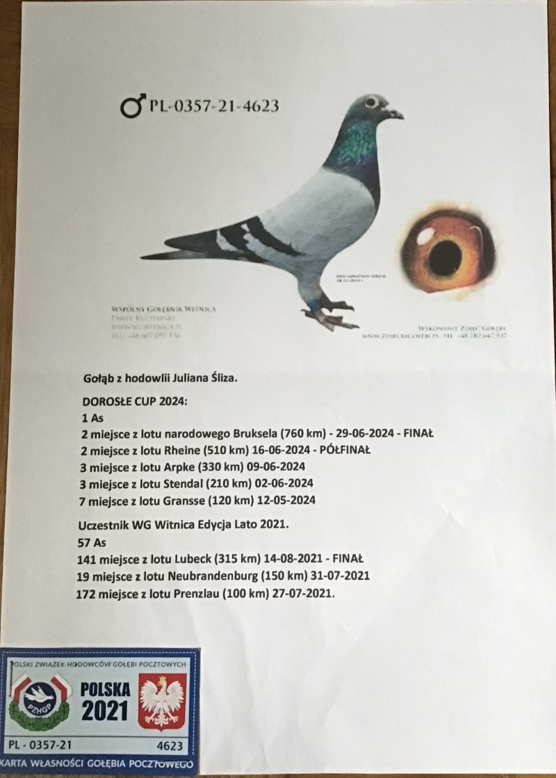 Opis: Oryginalny gołąb z hodowli Sławomira Żylińskiego. Uczestnik WG Roztocze 2024, z Lotu Finałowego powróciła jako 13 a ciężkiego Półfinału jako 10 zajmując tym samym 56 miejsce w kategorii AS. W załączeniu filmik z rozmowy z hodowcą. Szczegóły pochodzenia w rodowodzie. Więcej informacji od nr tel.: 516093273 **transport gołębia organizuje Kupujący ***GRATIS Samiec Juliana Śliza, który brał udział w lotach na WG Witnica w sezonie 2021r jako młody, a póżniej był lotowany na tym gołębniku przez 3 kolejne sezony z dobrymi wynikami. W sezonie 2024r zdobył tytuł 1 Asa. Wyniki samca na załączonym zdjęciu. Brak rodowodu do samca