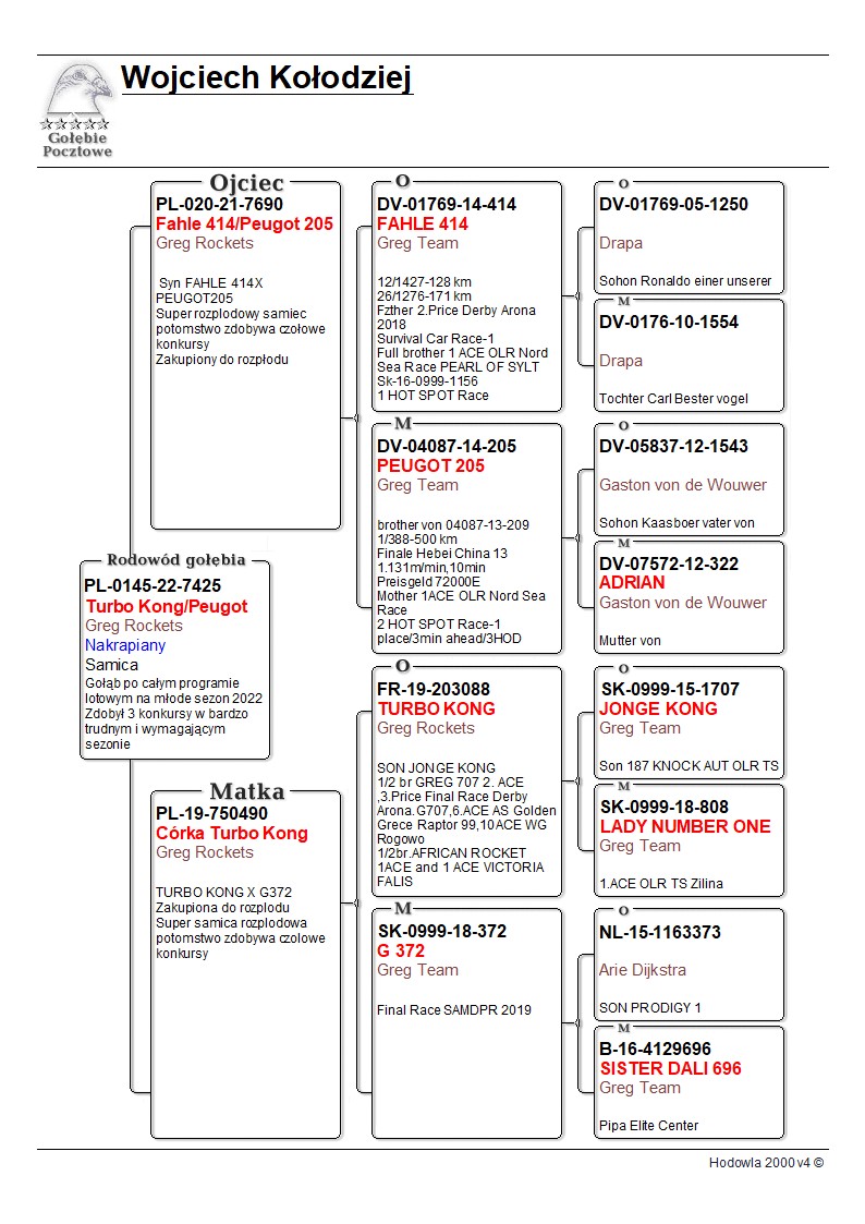 Opis: Oryginalny gołąb z hodowli Wojciecha Kołodzieja. Szczegóły pochodzenia w rodowodzie. Więcej informacji pod nr tel.: 608077136 **Wysyłka do 6 sztuk w jednej paczce za 150zł, przedpłata na konto