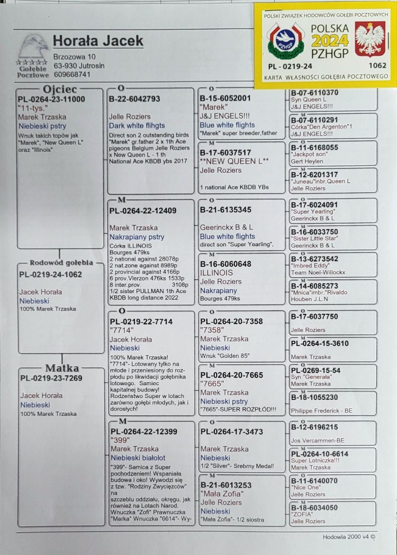 PL-0219-24-1062 samczyk wywodzący się z najlepszych gołębi Marka Trzaski - głównie Jelle Roziers