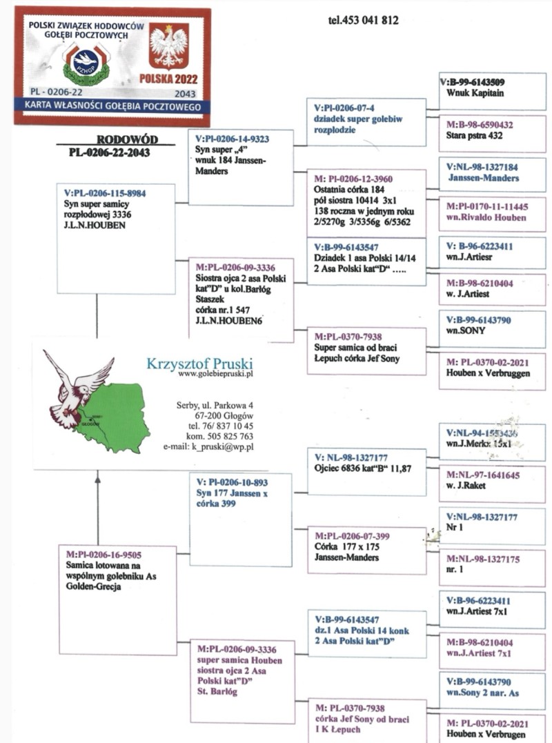 Opis: Oryginalny gołąb z hodowli Krzysztofa Pruskiego. Szczegóły pochodzenia w rodowodzie. Więcej informacji pod nr tel. 728 218 882 możliwość wysyłki
