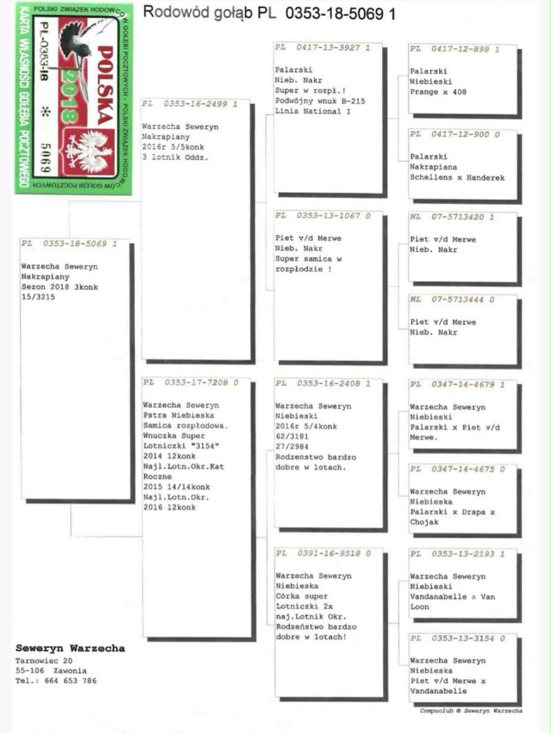 Opis: Oryginalny gołąb z hodowli Seweryna Warzechy. Szczegóły pochodzenia w rodowodzie. Więcej informacji pod nr tel. 728 218 882 możliwość wysyłki