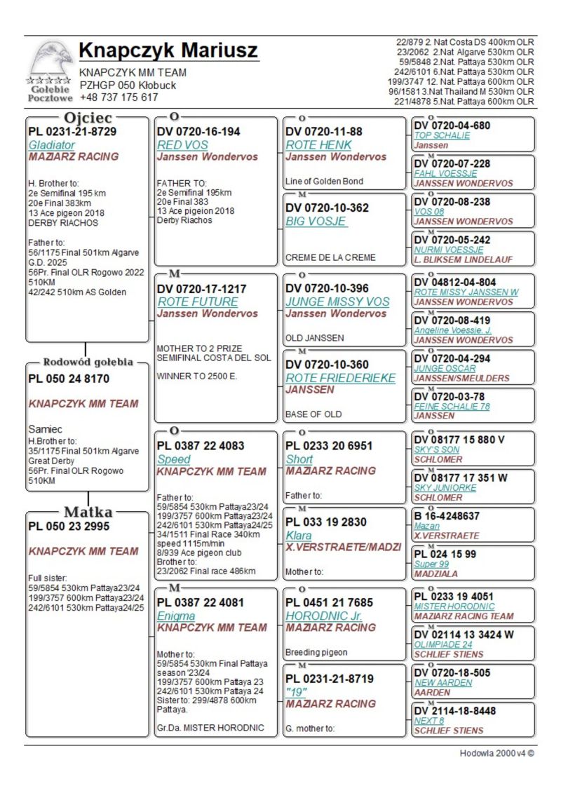 Opis: Ojcem gołębia jest syn słynnego "194" RED VOSa od Maziarz R.T. Matką jest siostra "Enigmy" z najlepszych linii Heremansa i Ardena "505" także od Maziarz R.T. Gołębie biorą udział w rywalizacji z największymi potentatami gołębiarskimi na świecie. Więcej szczegółów kontakt tel.