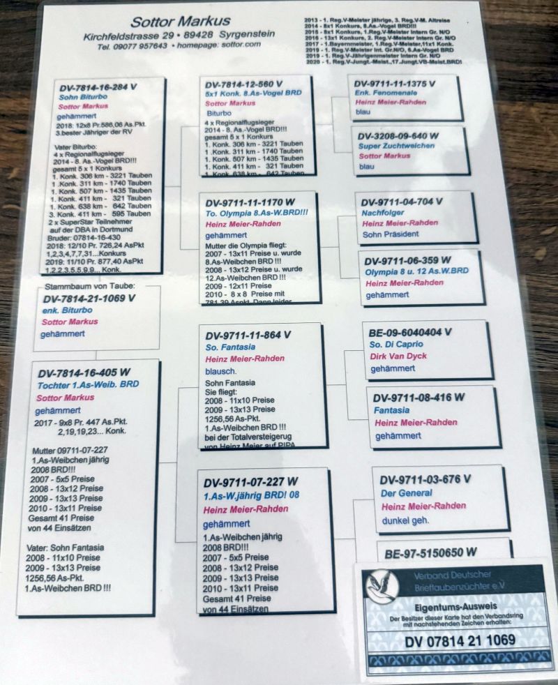 Opis: Oryginalny gołąb z hodowli Markusa Sottora. Szczegóły pochodzenia w rodowodzie. Więcej informacji pod nr tel.: 504 622 421 **możliwość wysyłki za pomocą firmy kurierskiej na koszt kupującego lub odbiór osobisty, bądź dowiezienie gołębi na wystawę do Katowic (w tym przypadku proszę o przedpłatę).