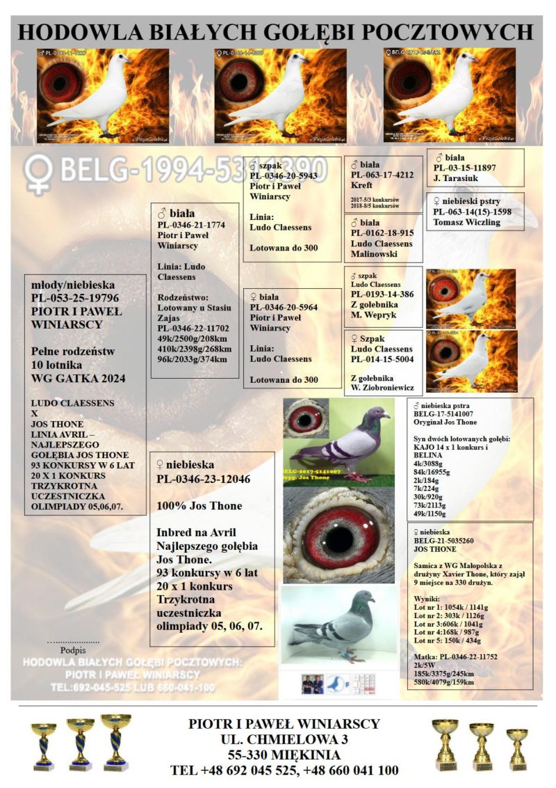 Opis: Kup teraz 160. Dzień dobry koleżanki i koledzy. Do sprzedania młode gołębie pocztowe z krzyżówek oryginalnych gołębi Jos Thoné z linii najszybszego gołębia Avril od Jos Thoné oraz białych gołębi lotowanych lub rozpłodowych z mojej hodowli którą prowadzę ponad 15 lat. Białe z linii Ludo Claessens, Mielczarek, Vangramberen, Van De Poel, Janssens Roland. Krzyżówki są idealne do lotu. W 2024 z takiego połączenia, młody został 10 lotnikiem na WG. Kolejny młody zdobył 5/6 konkursów w tym zlotu dodatkowego był 7 na rejon. Gołębie są sprzedawane z powodu rezygnacji z lotowania gołębiami w PZHGP. Pełne pochodzenie i karta do kazdego gołębia. Zachęcam do zadawania pytań. Jestem dostępny dla Państwa pod numerem telefonu 692045525. Do usłyszenia i zobaczenia. Do Myszkowa i Grudziądza wysyłka gratis. Proszę o kontakt przed zalicytowaniem w celu ustalenia płci i warunków transportu