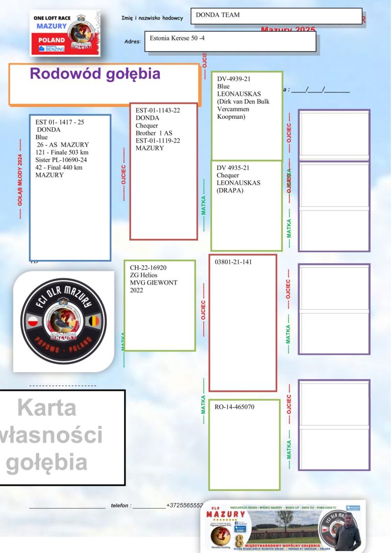 Opis: Gołąb EST-01-25-1417 - uczestnik 8 edycji OLR Mazury 2025. Ukończył cały program tegorocznej edycji. 121 miejsce z finału, 26 AS OLR Mazury.
