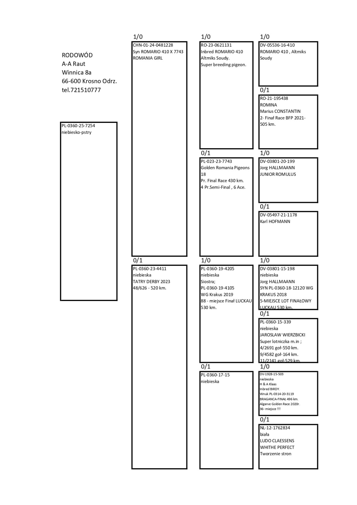 Opis: Gołąbek z MWG Carpatia, po całym sezonie lotowym 2025. Drużyna: A.A. Raut, 74 z 505 km i 86 z 185 km. Zorganizowaliśmy 9 lotów treningowych do 92km oraz 7 lotów konkursowych od 105 do 445km, a także ekstra finał z odległości 505km. Ptaki łącznie zrobiły 2153km, a niektóre nawet 2658km. Cały sezon był ciężki i wymagający, więc wszystkie ptaki, które sobie poradziły są warte i cenne uwagi. Więcej informacji pod numerem 783-265-592. Transport 100 zł do 2szt. Do 3-4szt - 150zł. Powyżej 5szt - 200zł. Zapraszamy do udziału w edycji 2026 :)