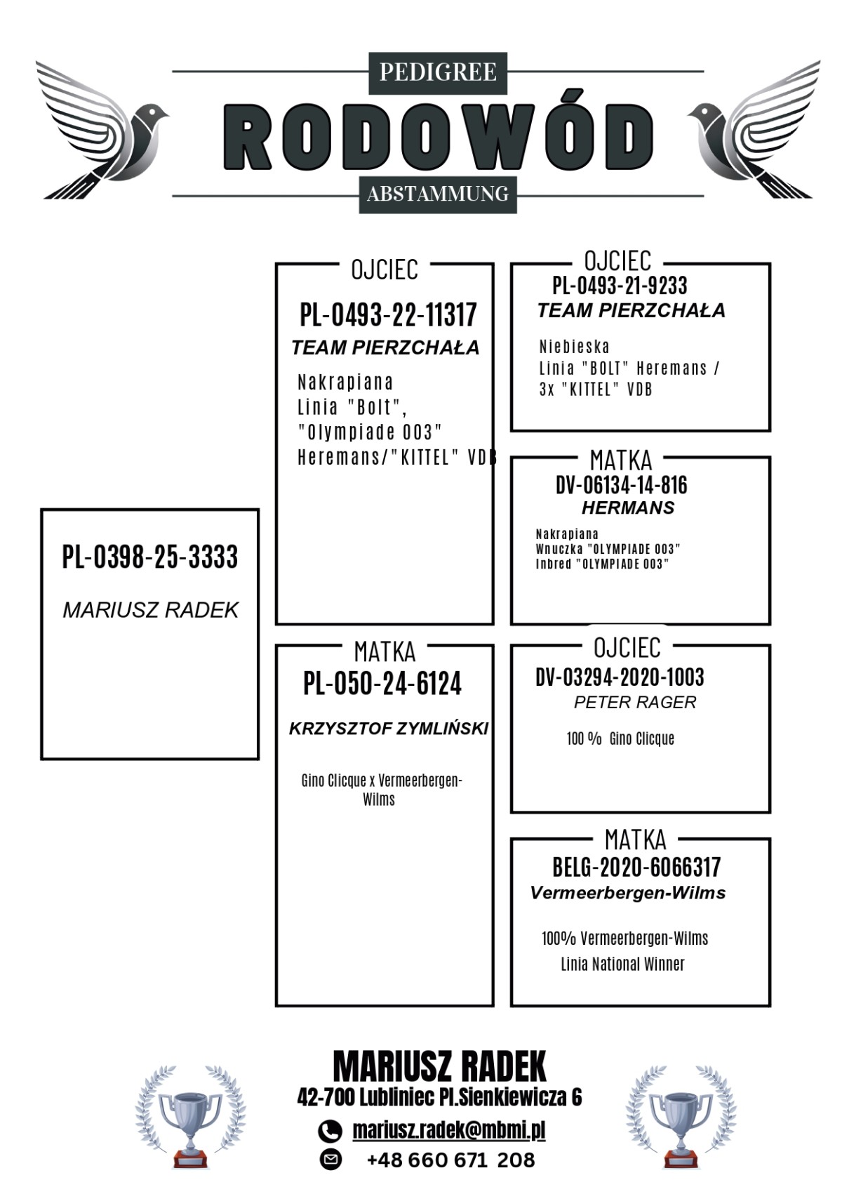 Opis: Gołąbek z MWG Carpatia, po całym sezonie lotowym 2025. Drużyna: MARIO TEAM, 50 z 120 km i 141 z 230 km. Zorganizowaliśmy 9 lotów treningowych do 92km oraz 7 lotów konkursowych od 105 do 445km, a także ekstra finał z odległości 505km. Ptaki łącznie zrobiły 2153km, a niektóre nawet 2658km. Cały sezon był ciężki i wymagający, więc wszystkie ptaki, które sobie poradziły są warte i cenne uwagi. Więcej informacji pod numerem 783-265-592. Transport 100 zł do 2szt. Do 3-4szt - 150zł. Powyżej 5szt - 200zł. Zapraszamy do udziału w edycji 2026 :)