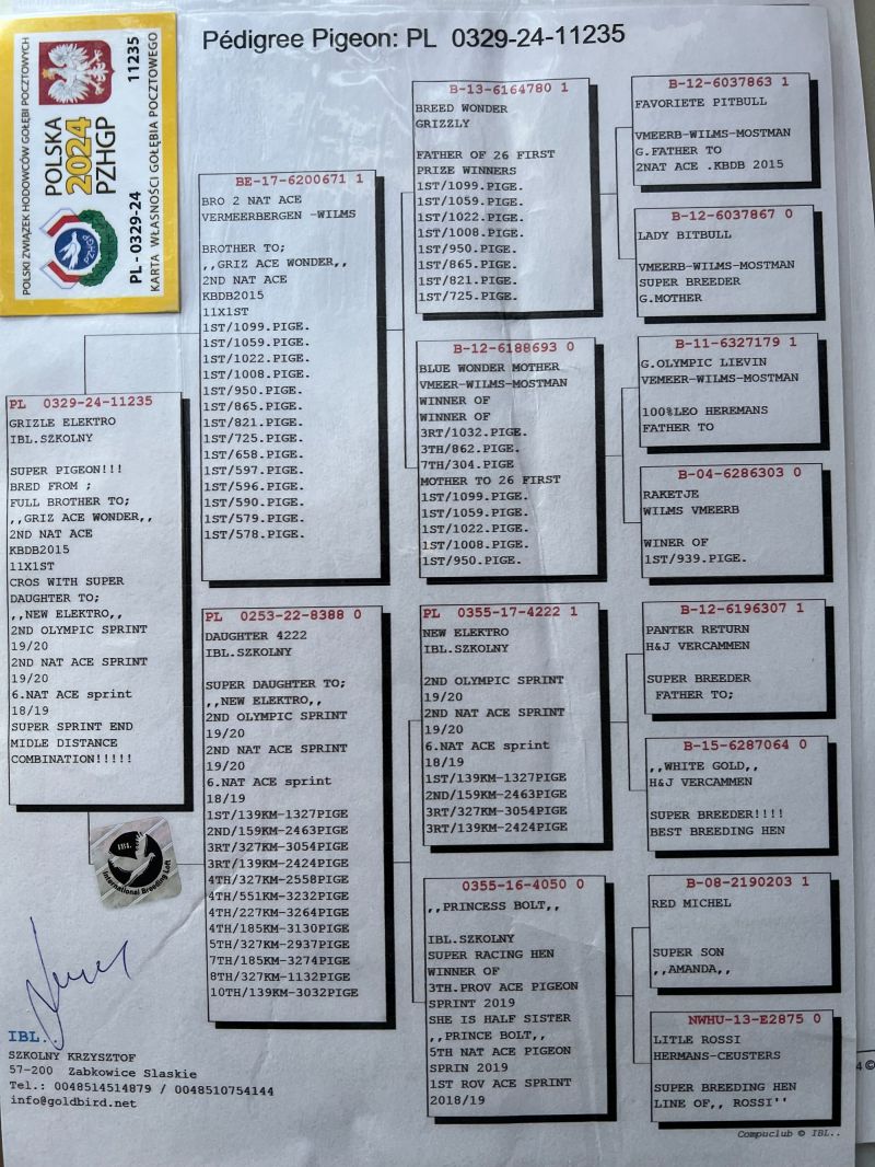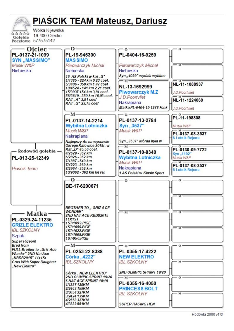 Opis: WNUCZKA PODSTAWOWEGO SAMCA ROZPŁODOWEGO HODOWLI "MASSIMO 300" ORYG. MICHAŁ PIWOWARCZYK - 16AS POLSKI W KAT. G 2020R / SAMCZYK TEN JEST OJCEM I DZIADKIEM WIELU CZOŁOWYCH LOTNIKÓW! |WNUCZKA WYBITNEJ LOTNICZKI "14-2214" - 1AS OKRĘGU KATOWICE W KAT. D 2018R! M.IN.: 4, 6, 7, 7, 8, 10, 15, 15, 18.. |Wiecej informacji o gołębiu pod nr tel.:577575142 Szczegóły pochodzenia gołębia w rodowodzie