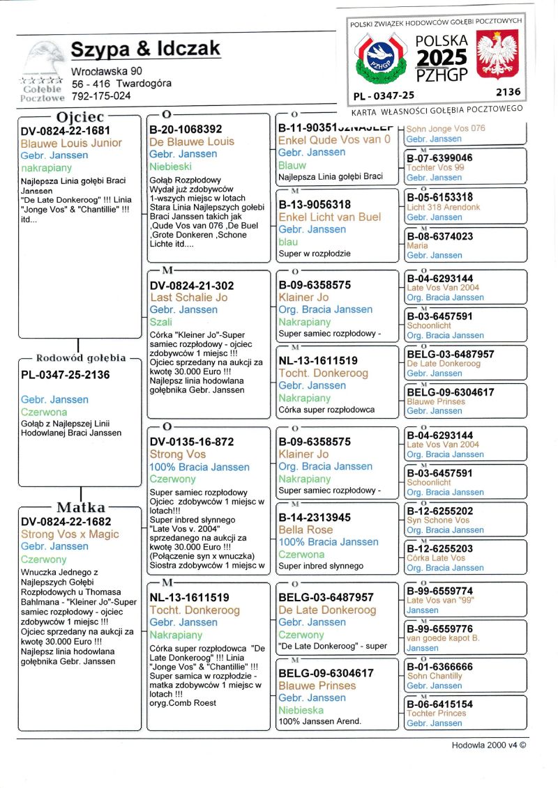 Opis: Profesjonalna hodowla z wieloletnim doświadczeniem, posiadająca w swoim stadzie materiał najwyższej światowej klasy. Więcej informacji w załączonych materiałach oraz pod nr tel. 792-175-024 Oferowany gołąb to prawdopodobnie SAMICA. Płeć pisana orientacyjnie Wysyłka 100 zł