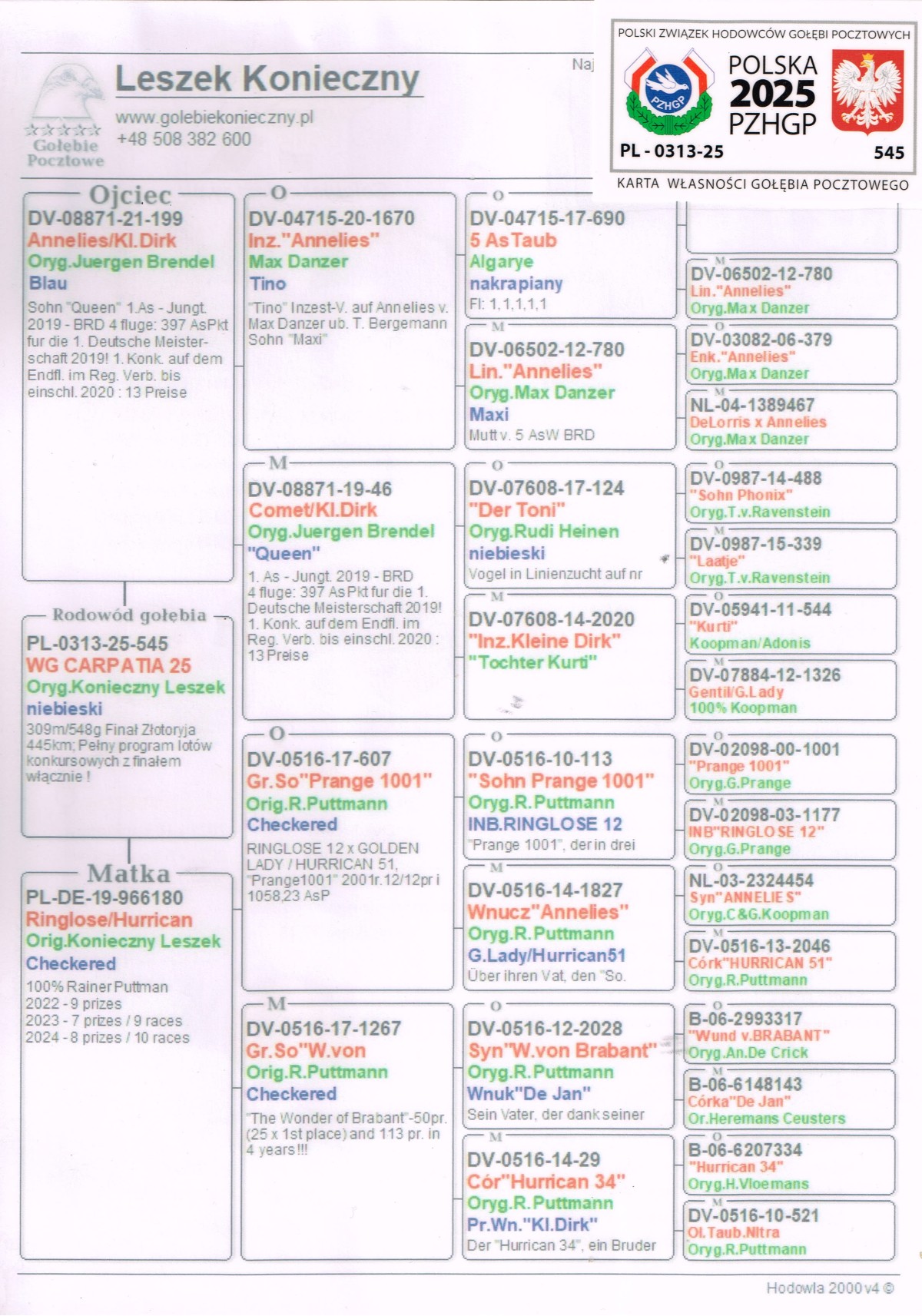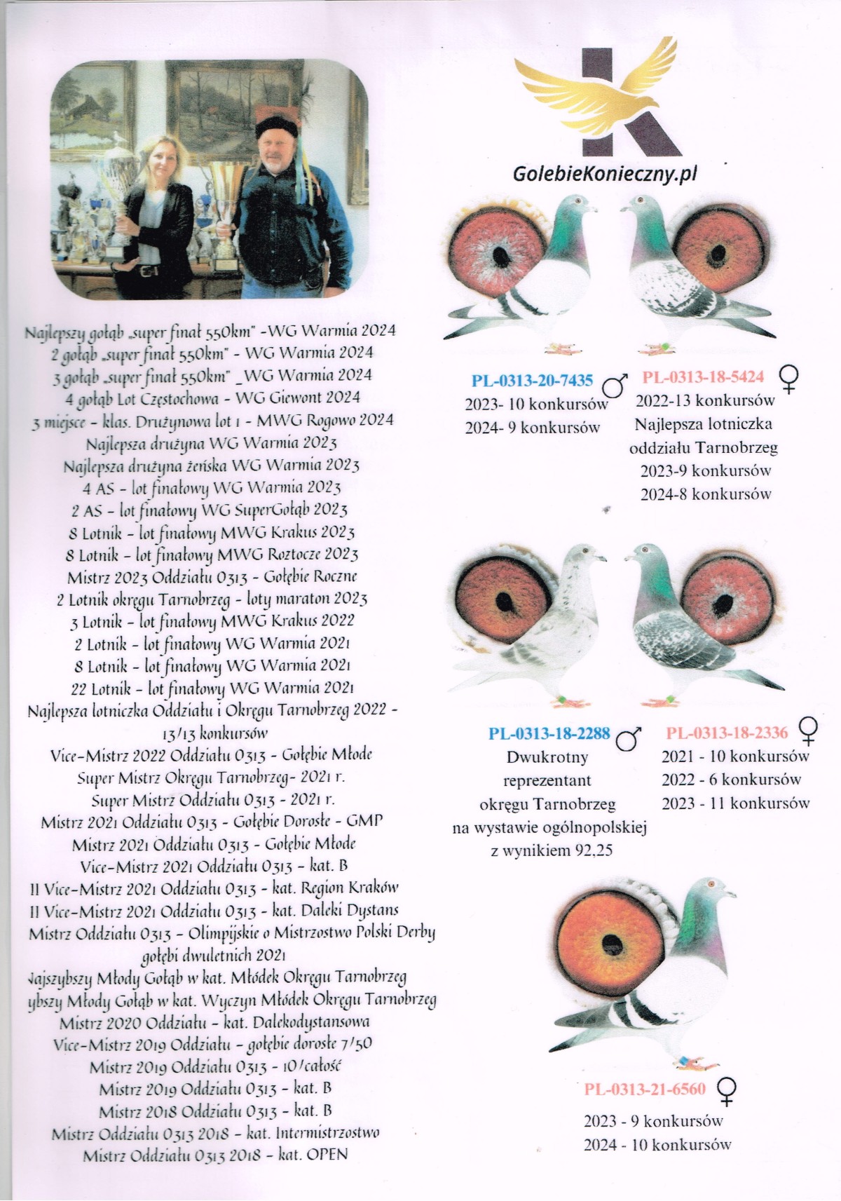 Opis: Gołąbek z MWG Carpatia, po całym sezonie lotowym 2025. Drużyna: Konieczna Ewelina B, 80 z 155 km i 156 z 120 km. Zorganizowaliśmy 9 lotów treningowych do 92km oraz 7 lotów konkursowych od 120 do 445km, a także ekstra finał z odległości 505km. Ptaki łącznie zrobiły 2153km, a niektóre nawet 2658km. Cały sezon był ciężki i wymagający, więc wszystkie ptaki, które sobie poradziły są warte i cenne uwagi. Więcej informacji pod numerem 783-265-592. Transport 100 zł do 2szt. Do 3-4szt - 150zł. Powyżej 5szt - 200zł. Gołąbki zostaną dostarczone do 14 dni po zakończeniu aukcji. Zapraszamy do udziału w edycji 2026 :)