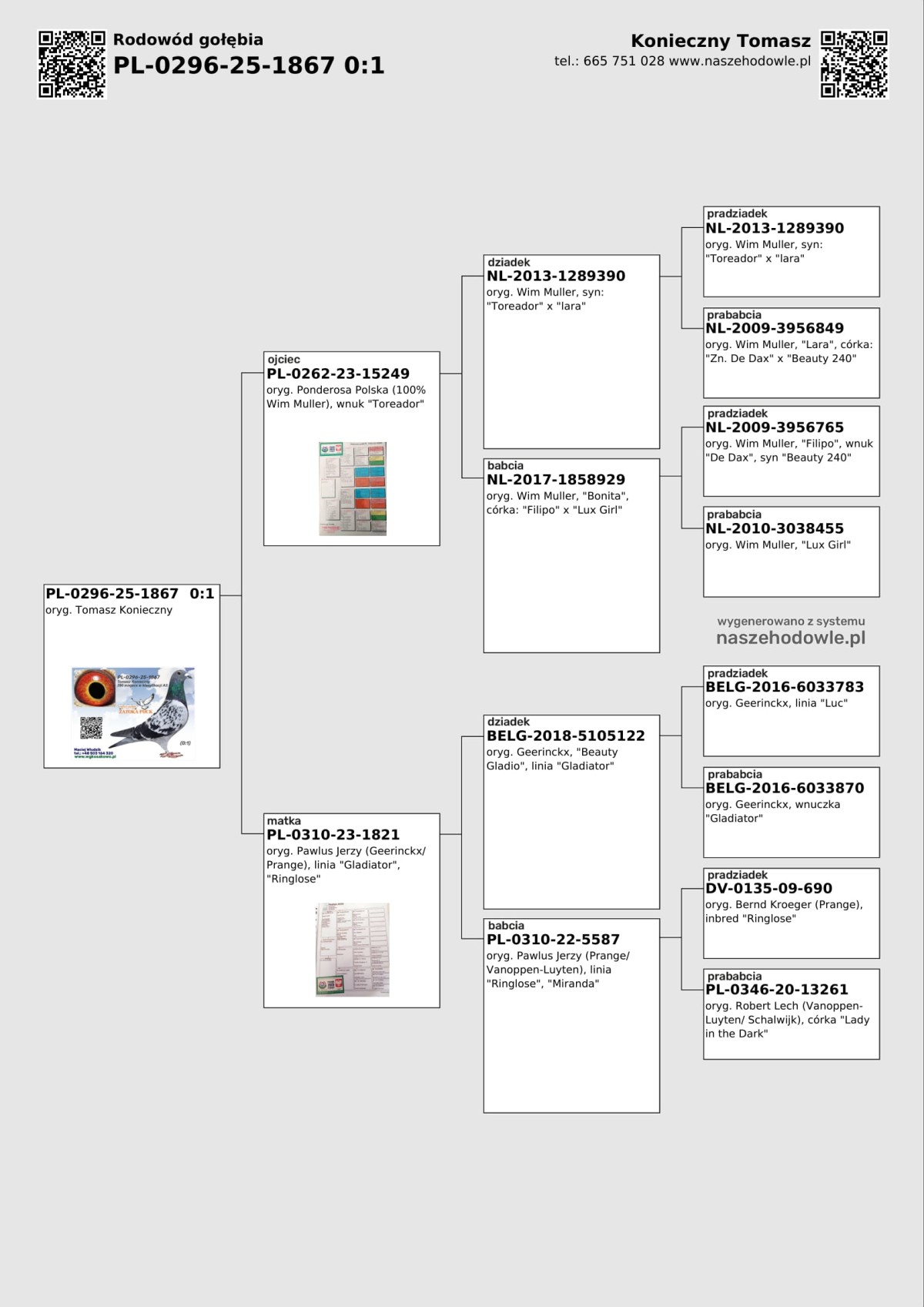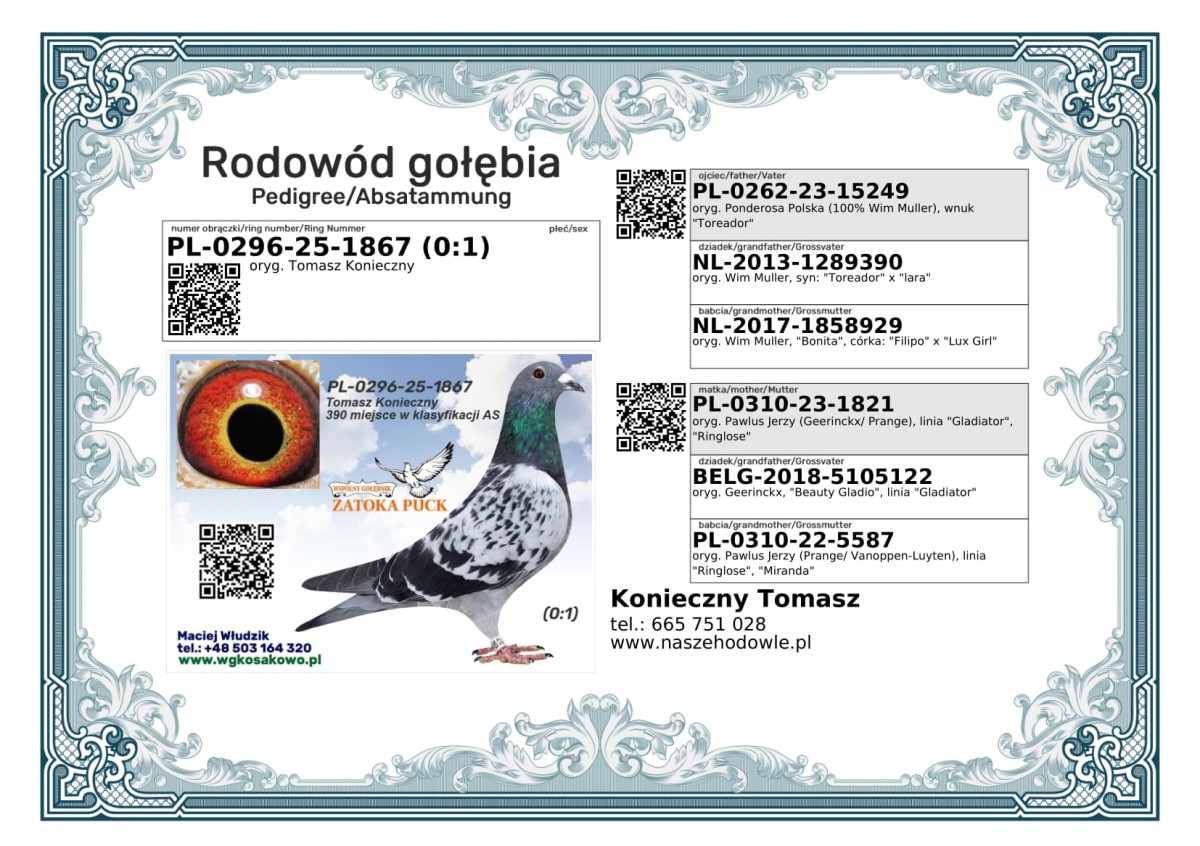 Opis: Tomasz Konieczny, 390 miejsce w klasyfikacji AS Gołąb uczestniczył w rywalizacji na WG Zatoka Puck 2025. Szczegóły pochodzenia w rodowodzie i załączonych materiałach. Wyniki lotowe w tabeli. Gołąb posiada tylko te materiały, które są widoczne na aukcji (karta własności, rodowód itp). Gołębie po zakończonej aukcji zostaną rozwiezione przez organizatora WG (koszt 150-200 zł w zależności od ilości gołębi i odległości), możliwy jest odbiór osobisty. Więcej informacji pod nr tel.: 503 164 320