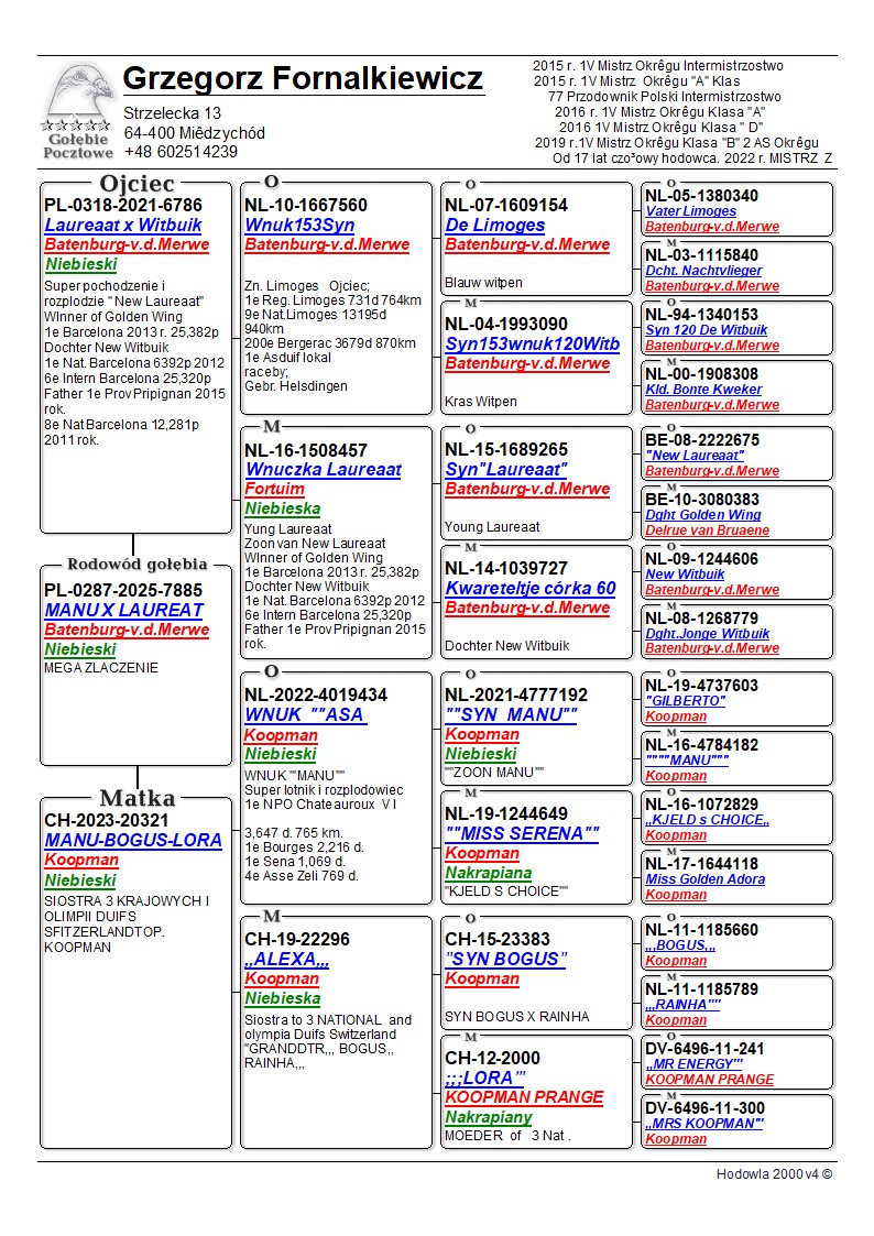 Opis: Super budowa i pochodzenie linia Lauereaat Batenburg Merwe x Koopman linia Manu długi dystans.