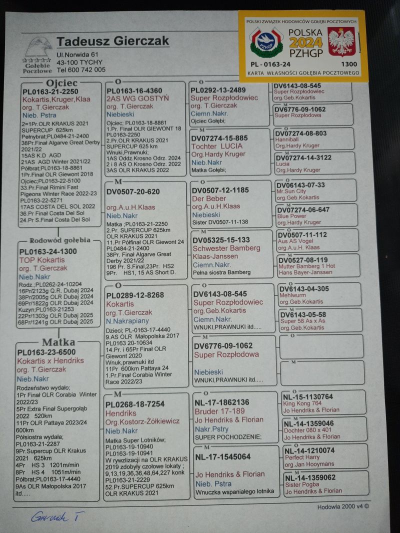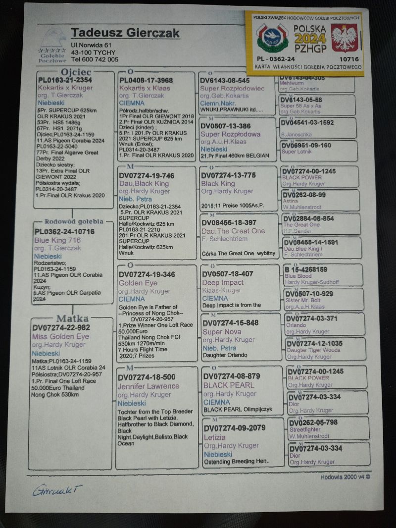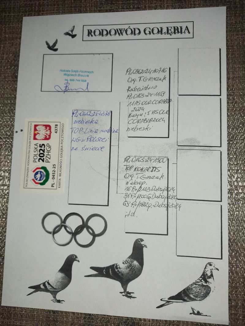 Opis: Na sprzedaż gołąbek 100% Tadeusz Gierczak, samiec, rodzina gołębi wspólnych gołębników. Szczegóły w rodowodzie samczyka oraz rodowodów rodziców. Zapraszam do kontaktu.