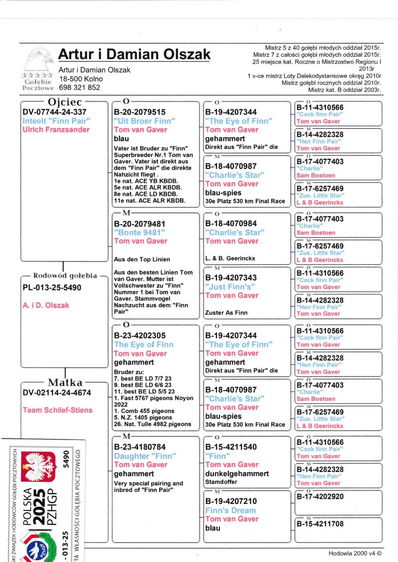 PL-013-25-5490 Wnuk brata Finna x wnuczka Finna 100% Tom van Gaver