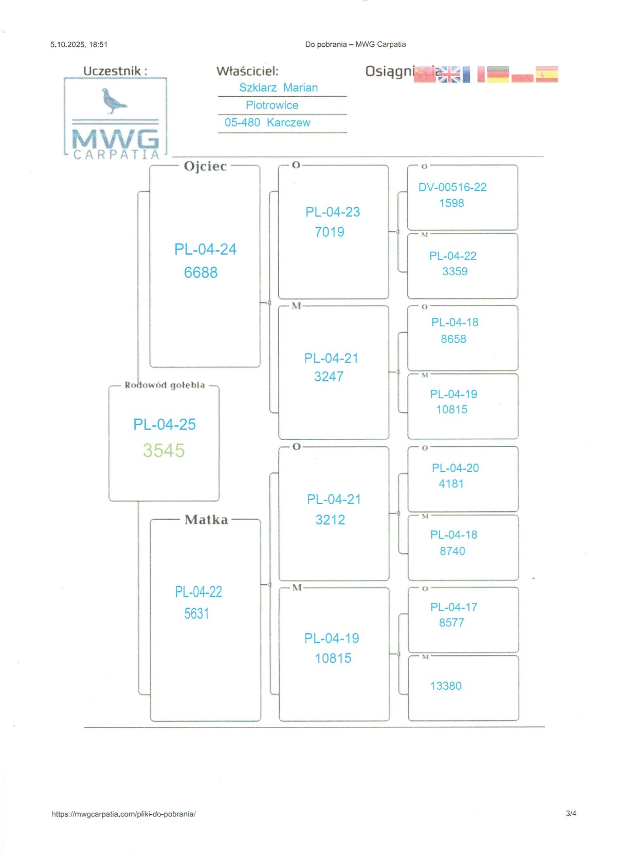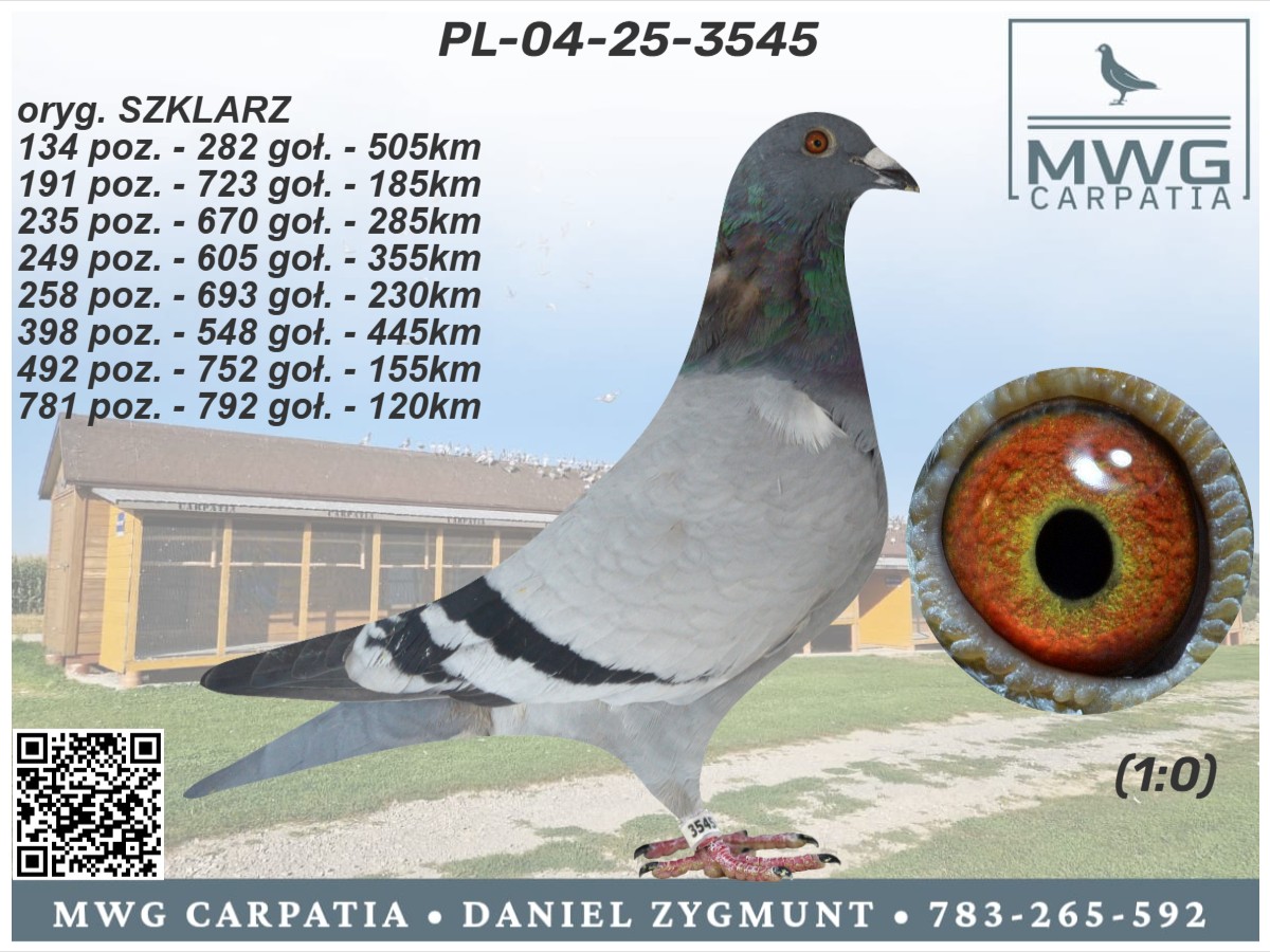 Opis: Gołąbek z MWG Carpatia, po całym sezonie lotowym 2025. Drużyna: SZKLARZ, 134 z 505 km i 191 z 185 km. Zorganizowaliśmy 9 lotów treningowych do 92km oraz 7 lotów konkursowych od 120 do 445km, a także ekstra finał z odległości 505km. Ptaki łącznie zrobiły 2153km, a niektóre nawet 2658km. Cały sezon był ciężki i wymagający, więc wszystkie ptaki, które sobie poradziły są warte i cenne uwagi. Więcej informacji pod numerem 783-265-592. Transport 100 zł do 2szt. Do 3-4szt - 150zł. Powyżej 5szt - 200zł. Gołąbki zostaną dostarczone do 14 dni po zakończeniu aukcji. Zapraszamy do udziału w edycji 2026 :)