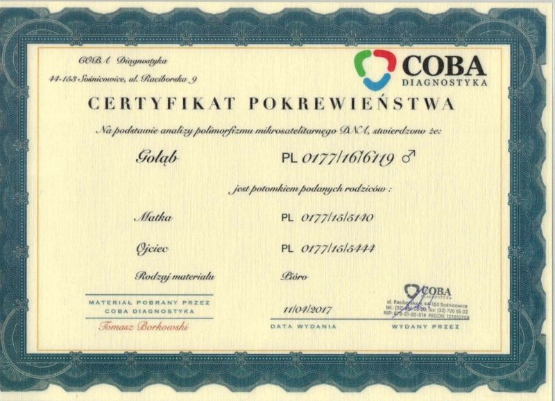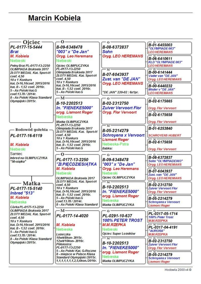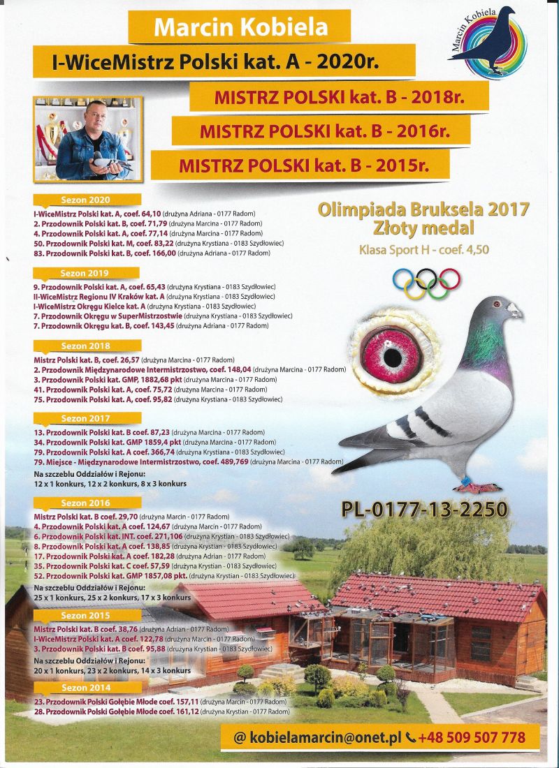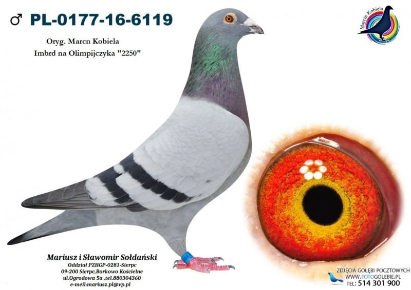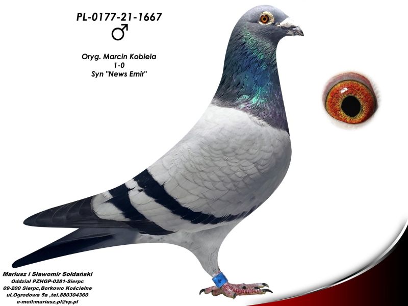 Opis: Oryginalny samiec z hodowli Marcina Kobieli super Linia "OLIMPIJCZYKA 2250" Jest synem New Emir który wydał super lotniki. Więcej informacji o gołębiu pod nr tel. i poniższych materiałach. Nasze wyniki w Mistrzostwie Polski 2018: 6 Miejsce w Intermistrzostwie Międzynarodowym - coeff. 151,73; 23 Miejsce GMP - 1874,73; 29 Miejsce Kat.B - coeff. 86,45. 1 Miejsce Gołąb Średni dystans-Konkurs Redakcji "Hodowca", 1 Miejsce Kat."B"-Konkurs Redakcji "Dobry Lot", 3 Miejsce Kat."D"-Konkurs Redakcji "Dobry Lot", 2 Miejsce "Mistrzostwo Asów Allround"-Konkurs Redakcji "Dobry Lot", 1 Miejsce Kat."B"-Konkurs Redakcji "Poradnik Hodowcy". 2019-Oddział Sierpc: Typowane Mistrz, Open I-vce Mistrz, Open 50 II-V-ce Mistrz, 1 i 3 Lotnik Roczny, Kat. A II V-ce Mistrz, Kat. B II V-ce Mistrz, Kat. D II V-ce Mistrz, Kat. GMP I v-Ce Mistrz, Kat. Inter. I V-ce Mistrz, Super. I V-ce Mistrz. Okręg Płock: II V-ce Mistrz Supermistrzostwo, I V-ce Mistrz GMP, II Lotnik. kat. B. 10 Gołębi w Reprezentacji Okręgu na Wystawę Ogółnopolską 2020. 2 AS POLSKI SPORT „B”-14,62 coef. 2020-Oddział Sierpc: Typowane Mistrz, Open I-vce Mistrz, Open 50 I-V-ce Mistrz, 1 Lotniczka Roczna, Kat. C Mistrz, Kat. M II V-ce Mistrz, Kat. D II V-ce Mistrz, Kat. GMP Mistrz, Kat. Inter. II V-ce Mistrz, Mistrz. Okręg Płock: Kat. GMP Mistrz , Kat.Roczne Mistrz, Kat. C-I Vce Mistrz , Kat. M - I Vce Mistrz Mistrz.Regionu I Łódż- V-ce Mistrz „Roczne” 2021- Supermistrz Oddziału Sierpc Mistrz Okręgu Płock Kat." Maraton" Supermistrz Okręgu Płock,2022 6 gołębi w reprezentacji Okręgu Płock na Wystawę Ogólnopolską.2022- II Supermistrz Oddziału Sierpc, 8 x V-ce Mistrz Oddziału. 1 AS WG Kaszuby 2022, 2 drużyna WG Kosakowo 2022, 4 AS WG Kosakowo. 6 AS WG Roztocze 2022. 6 gołębi w reprezentacji Okręgu Płock na Wystawę Ogólnopolską 2023. 2022-1 Samica w Polsce PL-0281-17-3077 w Kat. "Supermaraton"- Konkurs Redakcji"Hodowca". 2024 - 10 Miejsce w Polsce w kat. GMP 1 Miejsce Finał Wg Zatoka Puck 3 i 6 As Zatoka Puck