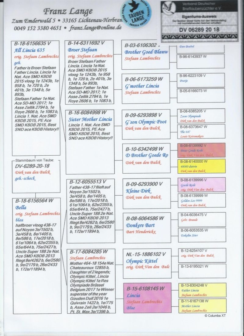 Opis: *SAMICA* Oryginalny gołab z hodowli Franza Lange. Są to gołębie które maja potwierdzona wartość rozpłodowa. Ich dzieci i wnuki bardzo dobrze latały. odbiór gołębi po stronie kupującego. kontakt 783495112 *100% Stefan Lambrechts. ojciec to kuzyn Lincii najlepszej samicy lotowej w historii Belgii w sprincie, a matka jest wnuczką Linci oraz Olimpic Kittel i Kleine Dirk od Dirka van de Bulcka. SUPER SAMICA ROZPŁODOWA! MATKA: