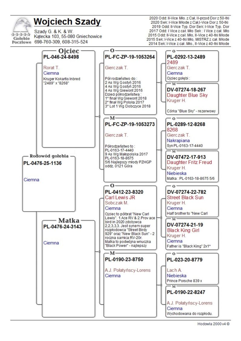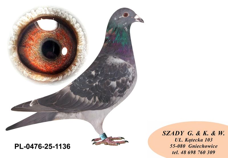 Opis: Witam. Gołąb pochodzi z hodowli Szady GKW. Szczegóły pochodzenia w rodowodzie. Zaszczepiony 16.09.2025 szczepionką RP VACC. Płatność za gołębia - przelew na konto. Transport będę organizował po zakończeniu wszystkich aukcji na początku grudnia. Koszt transportu indywidualnie w zależności od odległości i ilości gołębi. Więcej informacji pod nr tel. : 698 760 309. Prawdopodobnie samica.