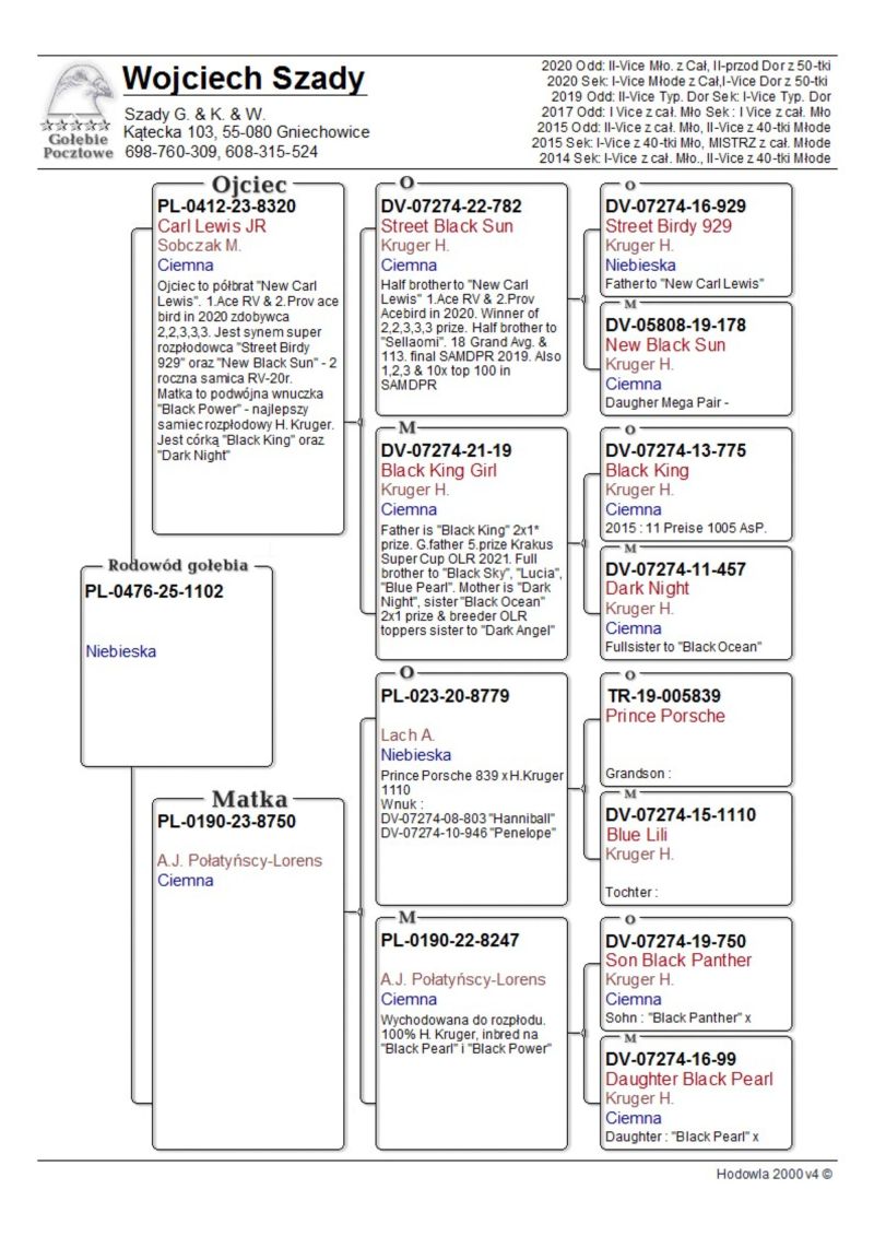 Opis: Witam. Gołąb pochodzi z hodowli Szady GKW. Szczegóły pochodzenia w rodowodzie. Zaszczepiony 16.09.2025 szczepionką RP VACC. Płatność za gołębia - przelew na konto. Transport będę organizował po zakończeniu wszystkich aukcji na początku grudnia. Koszt transportu indywidualnie w zależności od odległości i ilości gołębi. Więcej informacji pod nr tel. : 698 760 309. Prawdopodobnie samiec.