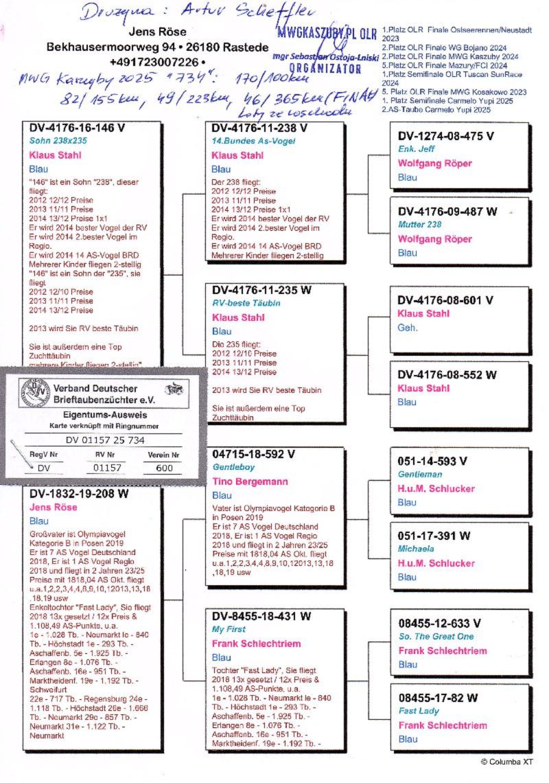 Opis: Gołąb (46 MIEJSCE z lotu Finałowego) brał udział w zawodach na Wspólnym Gołębniku KASZUBY. Więcej informacji w rodowodzie i załącznikach. Kontakt do Właściciela Gołębnika tel.601686344 (Sebastian Ostoja-Lniski). Informujemy poza tym, że rozpoczęły się zapisy na sezon 2026. Serdecznie zapraszam do rywalizacji. Uwaga! Koszty związane z transportem pokrywa nabywca gołębia. W zależności od kuriera wynoszą one około 150zł. Preferowany jest odbiór osobisty. Powyżej sylwetki gołębia znajduje się video z jego prezentacją.