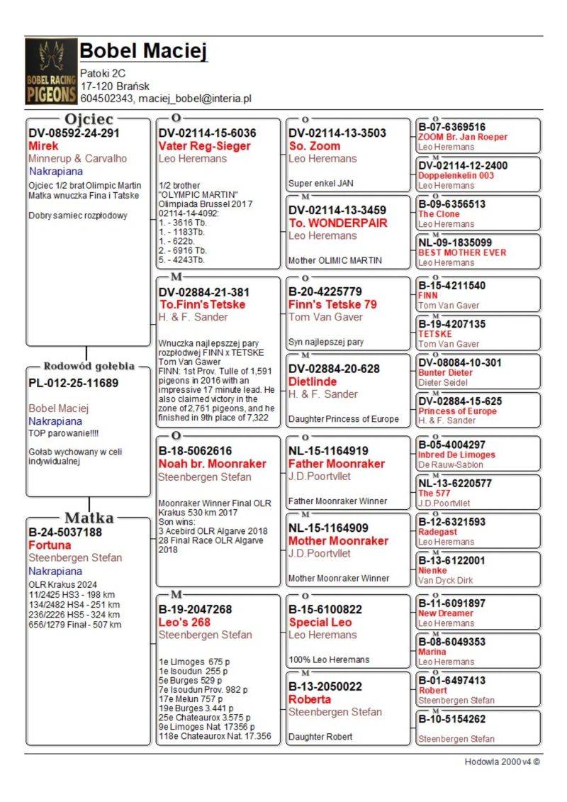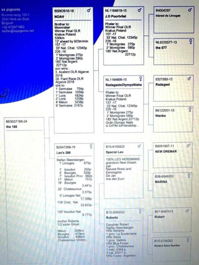 Opis: Na aukcji prawdopodobnie pięknie zbudowana samiczka wychowany w celi indywidualnej z połączenia dwóch wybitnych gołębi. Ojciec to gołąb z hodowli Minnerup & Carvalho z gołębi od strony Ojca Leo Heremans a od strony matki z gołębi znanego mistrza sportu gołębiarskiego Toma van Gaver. Matka oferowanego gołębia jest po całym programie lotowym na WG Krakus z hodowli Stefana Stenbergena. Szczegóły w rodowodzie. Preferowany odbiór osobisty woj. podlaskie, ewentualnie kurier w cenie ok 150 zł, bądź odbiór na wystawie ogólnopolskiej