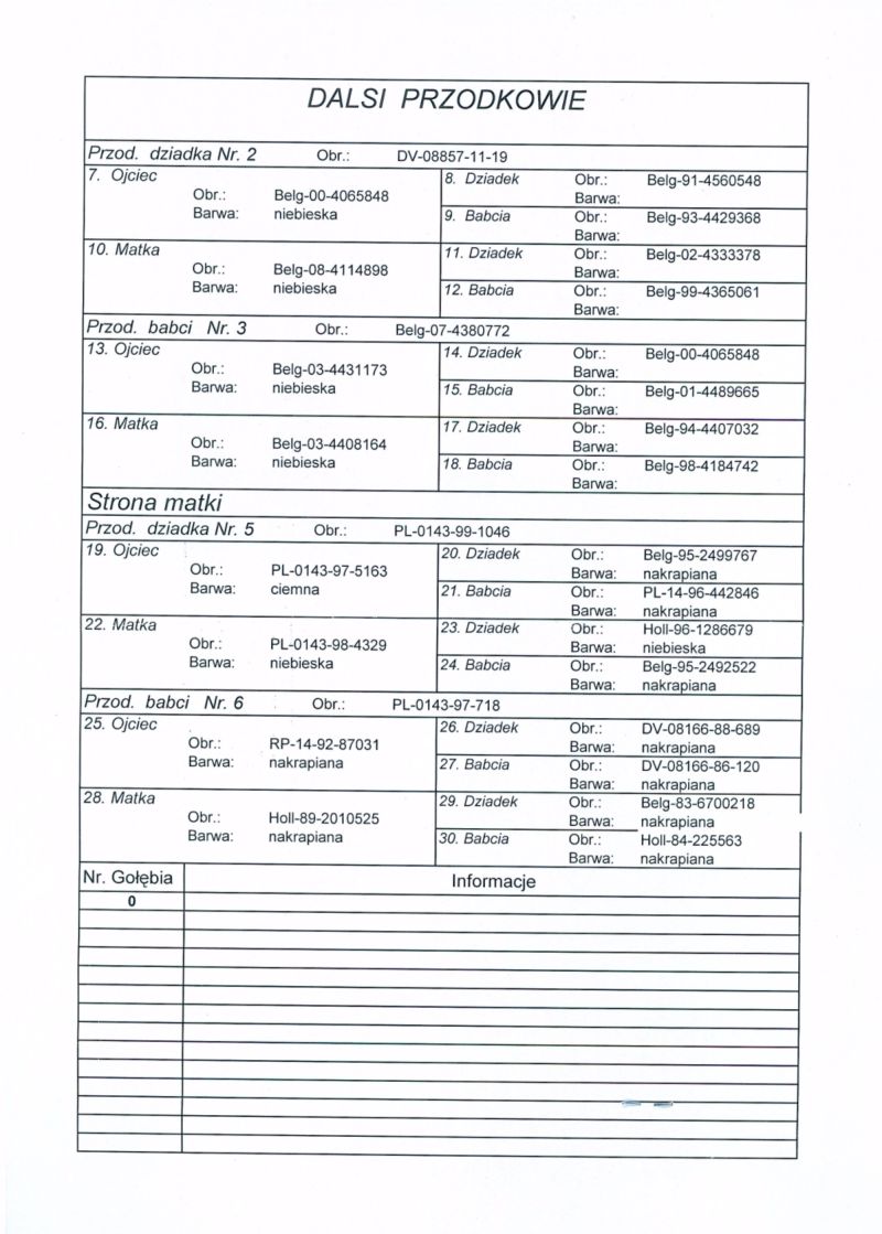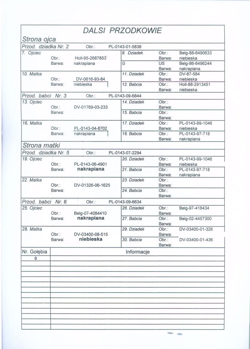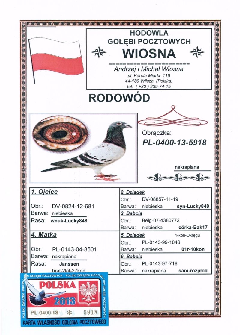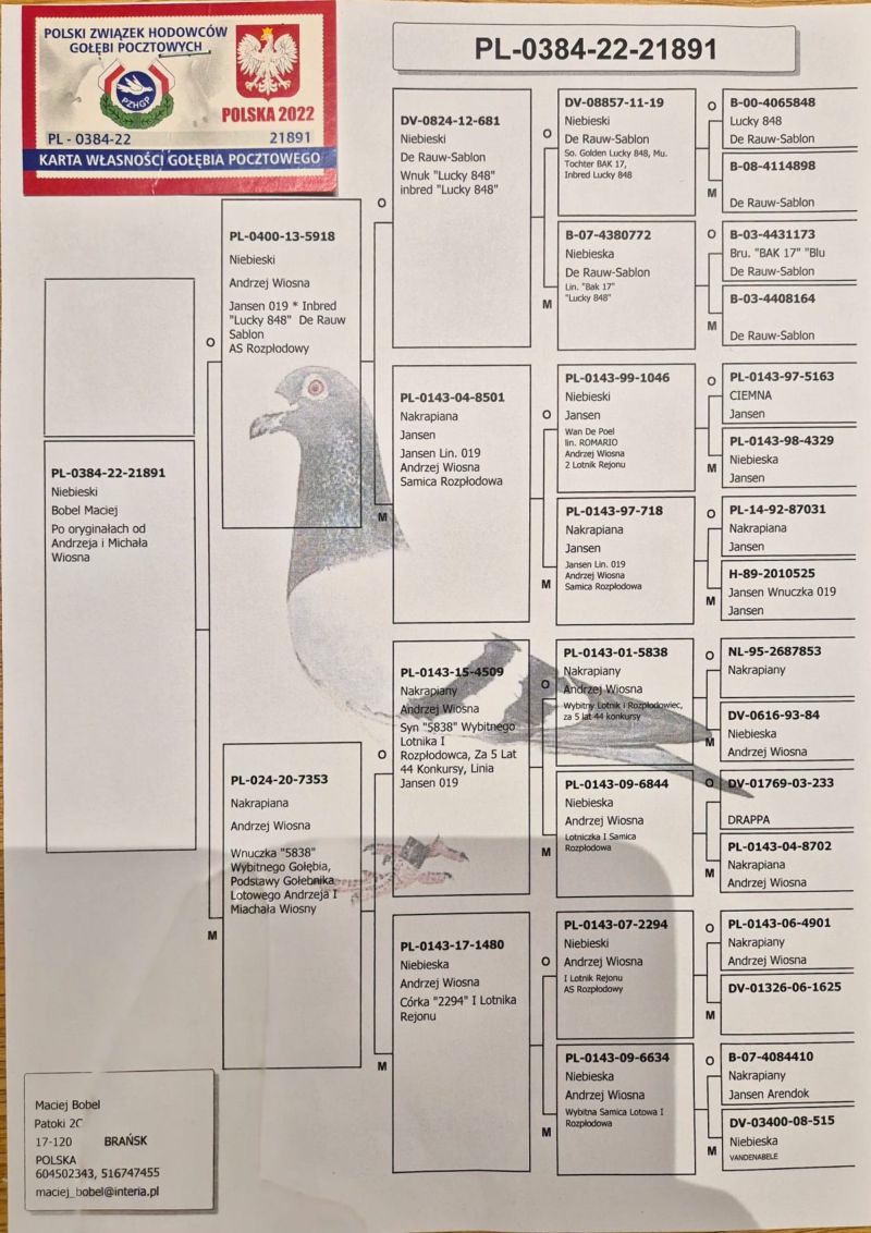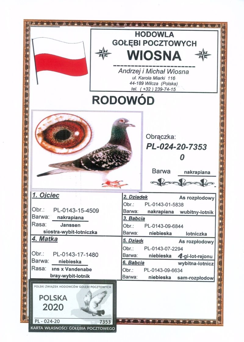 Opis: Na aukcji piękny samczyk po całym programie lotowym gołębi młodych po oryginalnych gołebiach Andrzeja i Michała Wiosna. Jest to gołąb z najlepszych linii hodowlanych kolegów Wiosna. Preferowany odbiór osobisty woj. podlaskie, ewentualnie kurier w cenie ok 150 zł, bądź odbiór na wystawie ogólnopolskiej