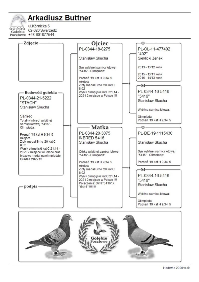 Opis: Przepiękny samczyk jest to pełen brat 8302 w 2023 roku 5/5 konk - 14 as oddz Poznań oraz pełen brat 8137-24 - 5/5 konk w 2024 roku - 4 as oddziału poznań !! , super krzyżówka Linia 5416 - S. Skucha - 3 x z rzędu wynik olimpijski , wnuk 17828 - najlepszy lotowy syn 461(brał udział w zdobyciu IX przod GMP w Polsce) , wnuk super samicy "265"(linia Olimpic Hurricane - Willim de Bruijne) od Sioen, która występuje tutaj jako babka ale jest też matką samczyka - 15 poz z Super Cup WG Krakus 2024 !oraz prawnuk samca rozpłodowego nr 2 na gołębniku - "791" "791" - ojciec "ZigZag McQueen" - 117 poz w finale SAMDPR , ojciec "Lotniskowej" , najlepszej samicy rozpłodowej u Kol Krzyśka Kusia oraz dziadek 8755 - rezerwa na olimpiadę w kat olimpijskiej maraton . Jest też pradziadkiem PL-0122-22-2219 - w 2 sezony na 21 wkładań 20 konkursów - kat A coeff 9,08 a z dwóch lat do wystaw kat A-74,86 , kat B-65,94 a kat D-72,20 W 2023 roku zdobył 1 konk na ok 4100 gołębi z miejsc Sulechów a w 2024 roku 2 x 2 konk w oddz !!! oraz PL-0122-22-5510 w kat A w 2024 roku uzyskał coeff. 4,75 Zdobył też 1 konk na oddz z miejsc. Brzeg Dolny na 4322 gołębie !! Został też 4 Asem Polski kat krótki dystans 2024 z coeff 17 z groszem z 5 lotów do kat A właśnie dla Kolegi Jacka Orszulika !!!oraz ojciec , dziadek i pradziadek wielu wybitnych gołębi rozpłodowych i lotowych na wielu gołębnikach !! "461" najważniejsze referencje z 2024 roku: 1 As Rejonu z 8 lotów rejonowych - prawnuczka 461 u Kol Adama Gasperowicza, prawnuk "461" wygrał finał na WG Podhale wygrywając 50 000 dla Kolegi Bogdana Bieli !- liczba jedynek jego wnuków , prawnuków i oczywiście dzieci będzie około stu a kilkadziesiąt gołębi z 461 zajmowało top 10 w kat As w różnych kategoriach w różnych okręgach w Polsce- tylko w 2022 roku w 9 różnych oddziałach przeważnie prawnuki zdobywały 1 lokatę w oddz !!! Jego wnuczka została też na olimpiadzie w tym roku 4 gołębiem świata w kat H dla Kol Łukasza Reguły. !! Na screenie przykład jak potrafią siadać gołębie w oddz z linii 461 ... 3-prawnuk,4 -wnuk , 5-wnuk , 6 - roczna wnuczka - kat A 9 z groszem ma , 7 wnuk , 11 - wnuk oraz 15 - wnuk 461. oraz kolejny lot z 2020 roku : 1,2,3,5,7,8 wnuk oraz 15 prawnuk ? do tego roczna samiczka Kolegów Piotra I Marcina Żureckich z Kępna została 6 asem Polski w kat G ...tak leciała... 2 na 5200 g ze 174 km 8 na 4573 z 219 km 8 na 3583 g z 324 km 8 na 1764 g z 324 g 21 na 4535 g z 549 km - rej - coeff jak widać na zdjęciu 13,54 miała też szósty super lot była 25 na 4984 g coeff 5,02 1 goląb z Extra finału na WG Giewont 2022 dla Teamu Chudy-Molek to też linia "461" ojciec to syn mojej super wdowy 2161-12 ,, Dwie Prawnuczki .... u Kol Kazimierza Goździejewskiego ( jedna w kat M w 2023 roku miała coeff 4,84 ( 1 as okręgu Wałbrzych a druga w 2024 roku 2,58 - 2 x 1 na oddział (2 as Polski kat M w/g miesięcznika "Hodowca") - w kat "I" - coeff 9 z haczykiem), "461" to też pradziadek PL-0122-22-2219 - w 2 sezony na 21 wkładań 20 konkursów - kat A coeff 9,08 a z dwóch lat do wystaw kat A-74,86 , kat B-65,94 a kat D-72,20 W 2023 roku zdobył 1 konk na ok 4100 gołębi z miejsc Sulechów a w 2024 roku 2 x 2 konk w oddz !!! oraz pradziadek PL-0122-22-5510 w kat A w 2024 roku uzyskał coeff. 4,75 Zdobył też 1 konk na oddz z miejsc. Brzeg Dolny na 4322 gołębie !! Został też 4 Asem Polski kat krótki dystans 2024 z coeff 17 z groszem z 5 lotów do kat A właśnie dla Kolegi Jacka Orszulika !!! oraz wiele,wiele innych.....od 2017 roku 30x mistrzostwo oddz w różnych kategoriach w tym 2019-2021 3 x z rzędu supermistrzostwo oddziału Poznań, więcej info 601 877 544