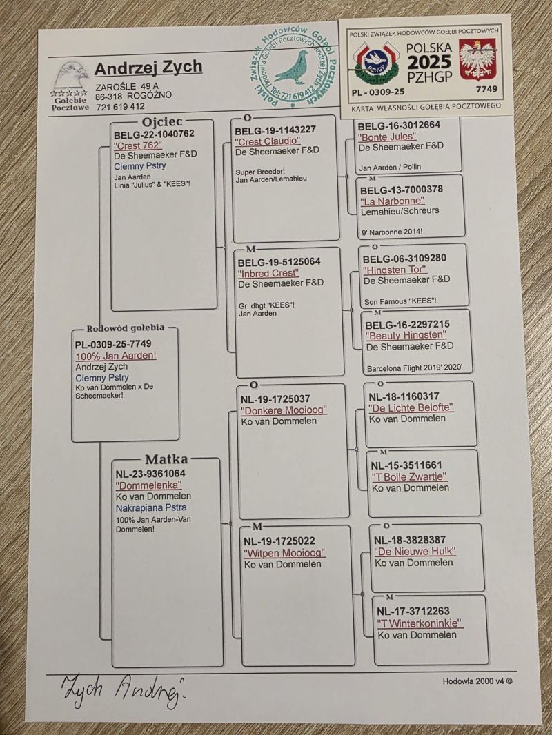PL-0309-25-7749 - 100% Jan Aarden-van Dommelen! Super inbred! Na Loty Daleko dystansowe! Unikat! Okazja!
