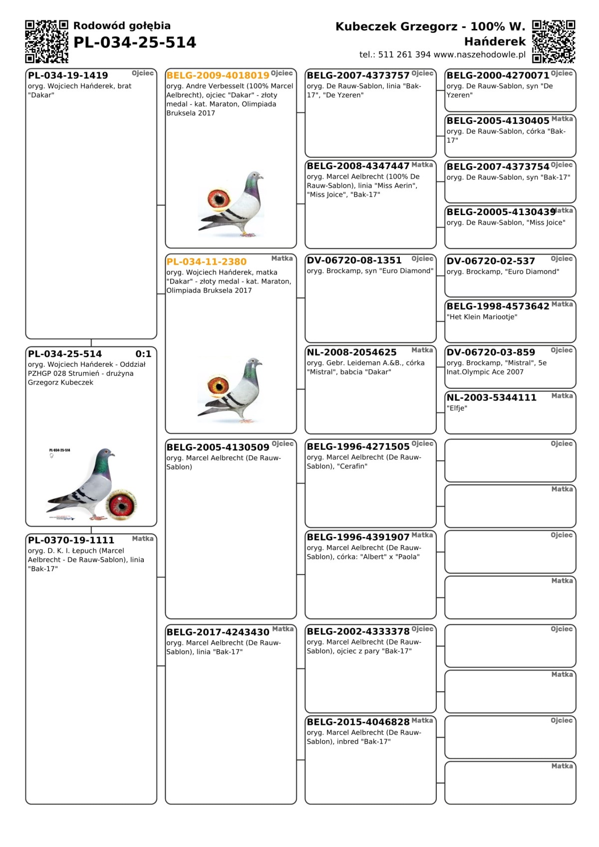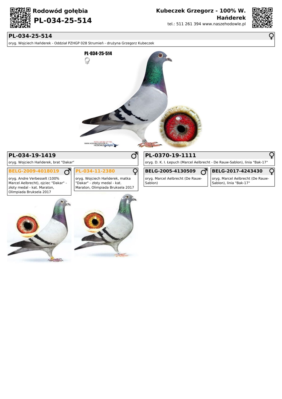 Opis: oryg. Wojciech Hańderek - Oddział PZHGP 028 Strumień - drużyna Grzegorz Kubeczek Gołąb lotowany w oddziale 028 Strumień w drużynie: Grzegorz Kubeczek. Wyniki gołębi na rodowodach. Szczegóły pochodzenia w rodowodzie i załączonych materiałach. Więcej informacji pod nr tel.: 511 261 394. *odbior na wystawie ogólnopolskiej