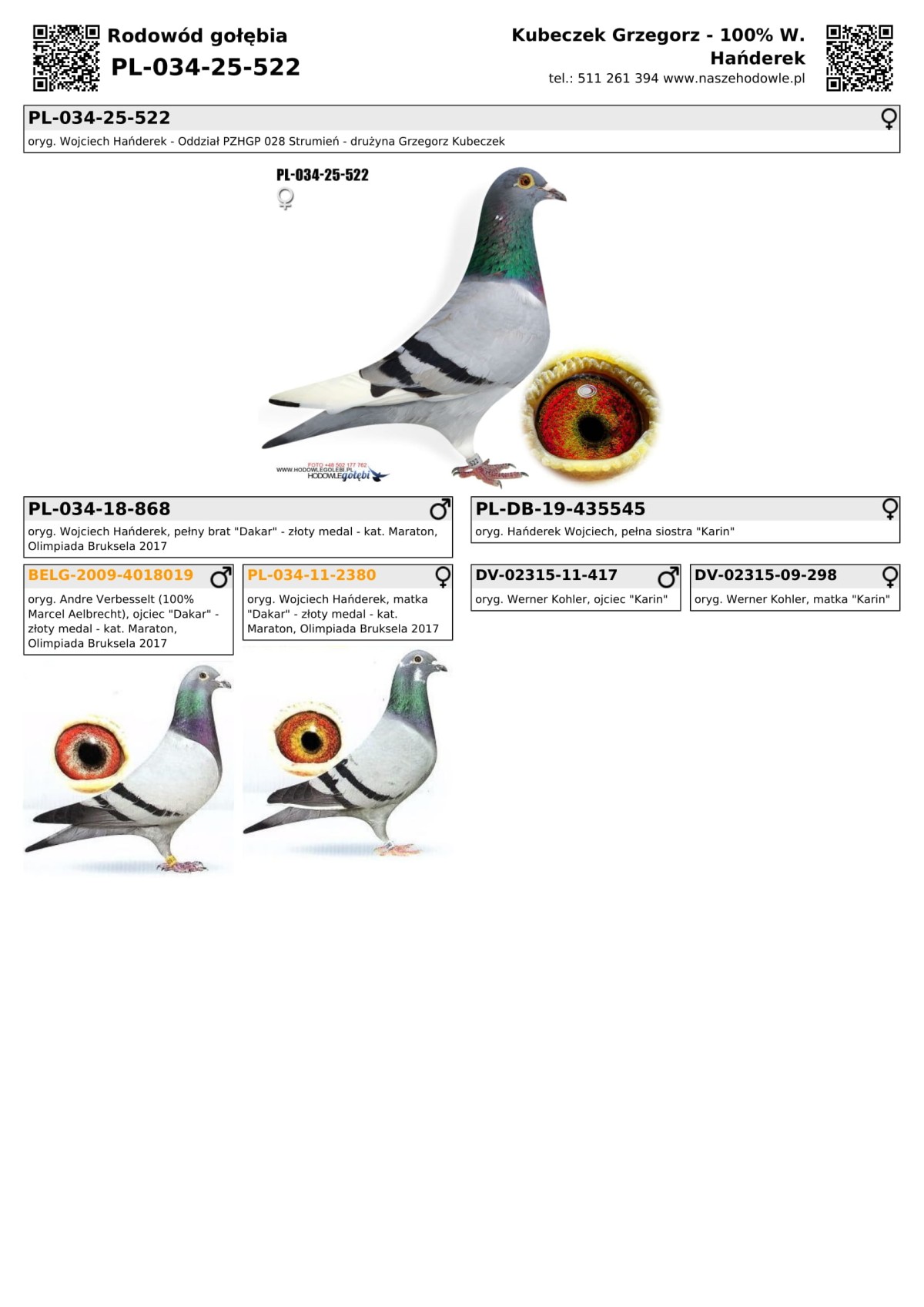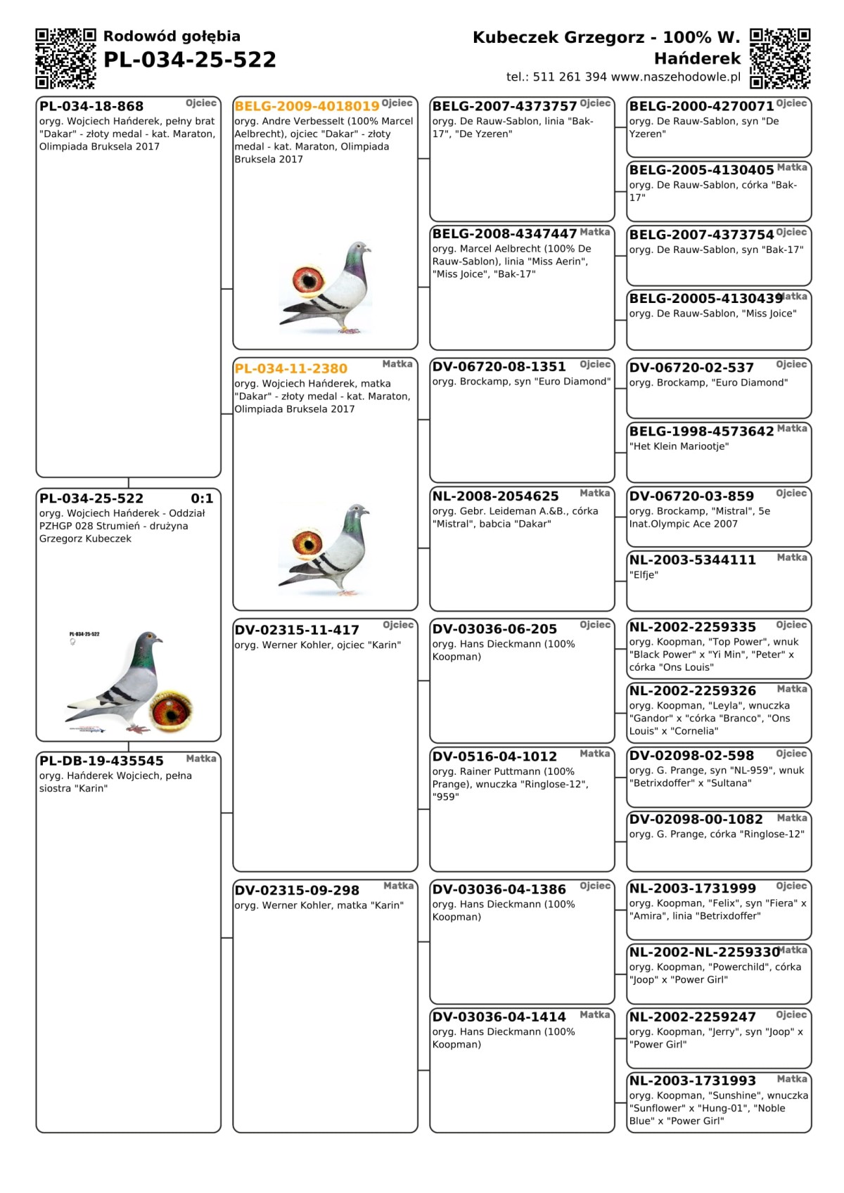 Opis: oryg. Wojciech Hańderek - Oddział PZHGP 028 Strumień - drużyna Grzegorz Kubeczek Gołąb lotowany w oddziale 028 Strumień w drużynie: Grzegorz Kubeczek. Wyniki gołębi na rodowodach. Szczegóły pochodzenia w rodowodzie i załączonych materiałach. Więcej informacji pod nr tel.: 511 261 394. *odbior na wystawie ogólnopolskiej