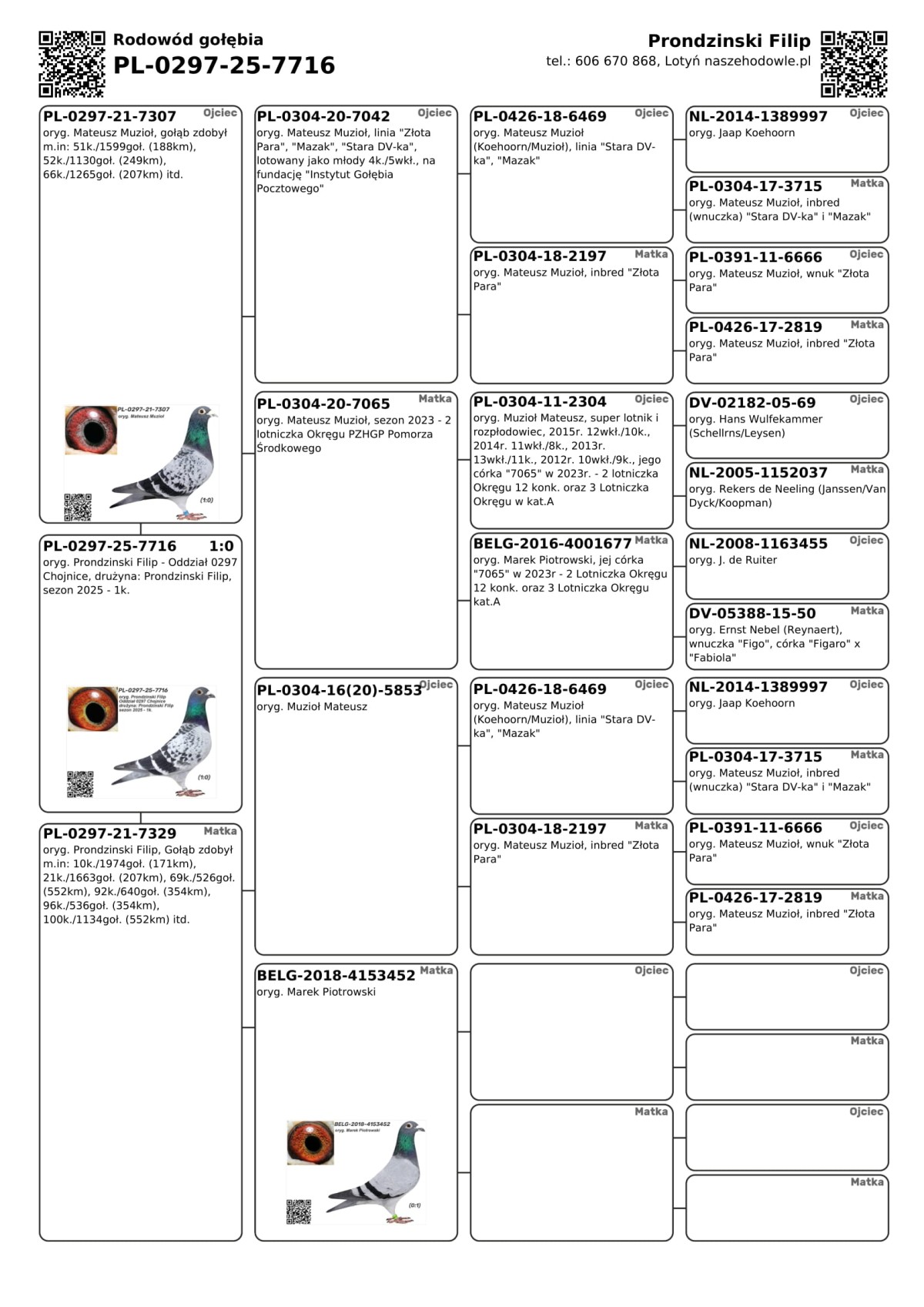Opis: oryg. Prondzinski Filip - Oddział 0297 Chojnice, drużyna: Prondzinski Filip, sezon 2025 - 1k. Gołąb był lotowany w sezonie 2025 w Oddziale PZHGP 0297 Chojnice w drużynie Filip Prondzinski w ramach Polskiej Ligii Gołębi Pocztowych. Wyniki za poszczególne loty dostępne są w tabeli wyników. Zapewniamy transport gołębi w cenie: od 1 do 6 szt. - 150 PLN i od 7 do 12 szt. 200 PLN. Gołębia można również odebrać osobiście w Tucholi, Chojnicach lub na Wystawie Ogólnopolskiej w Katowicach. Więcej informacji u kol. Filipa Prondzinskiego pod nr tel.: 606 670 868.