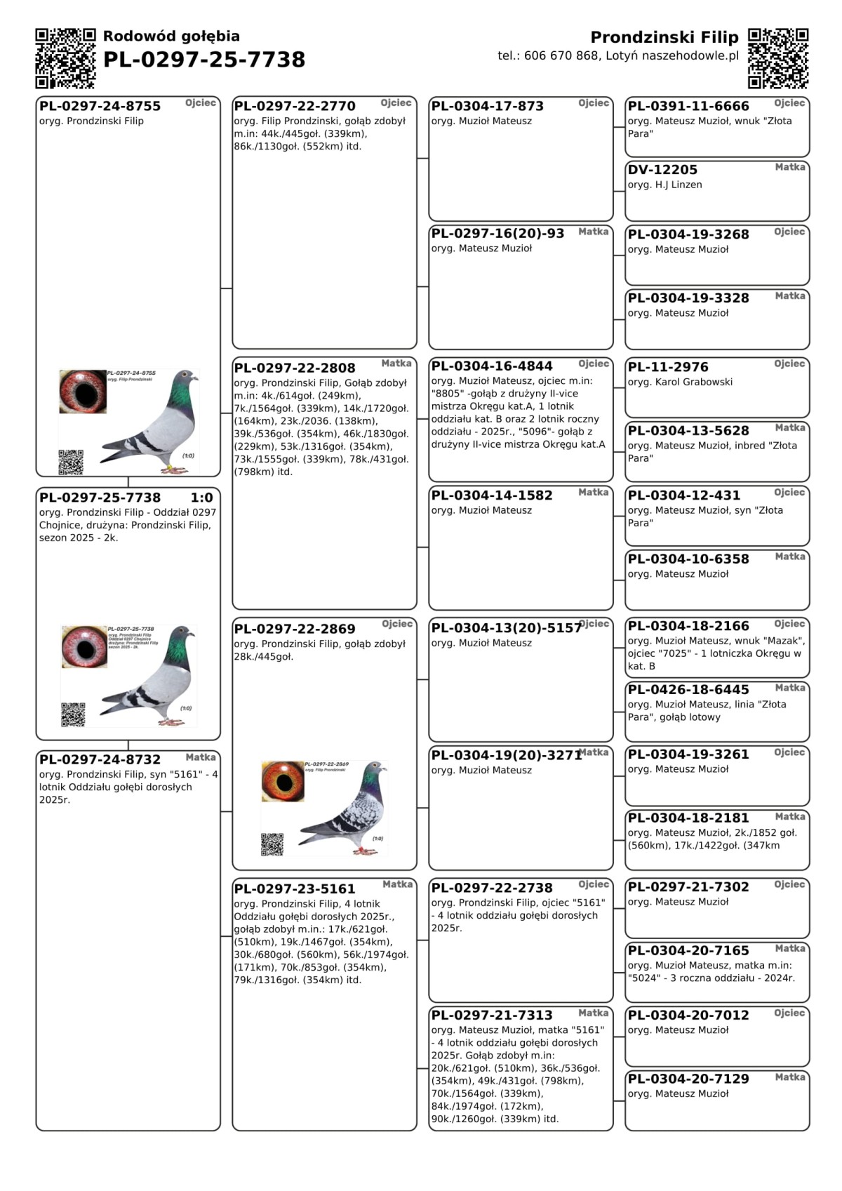 Opis: oryg. Prondzinski Filip - Oddział 0297 Chojnice, drużyna: Prondzinski Filip, sezon 2025 - 2k. Gołąb był lotowany w sezonie 2025 w Oddziale PZHGP 0297 Chojnice w drużynie Filip Prondzinski w ramach Polskiej Ligii Gołębi Pocztowych. Wyniki za poszczególne loty dostępne są w tabeli wyników. Zapewniamy transport gołębi w cenie: od 1 do 6 szt. - 150 PLN i od 7 do 12 szt. 200 PLN. Gołębia można również odebrać osobiście w Tucholi, Chojnicach lub na Wystawie Ogólnopolskiej w Katowicach. Więcej informacji u kol. Filipa Prondzinskiego pod nr tel.: 606 670 868.