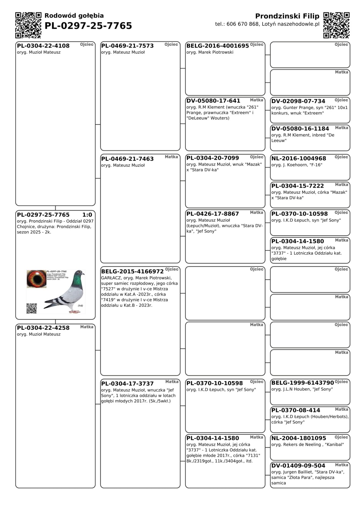 Opis: oryg. Prondzinski Filip - Oddział 0297 Chojnice, drużyna: Prondzinski Filip, sezon 2025 - 2k. Gołąb był lotowany w sezonie 2025 w Oddziale PZHGP 0297 Chojnice w drużynie Filip Prondzinski w ramach Polskiej Ligii Gołębi Pocztowych. Wyniki za poszczególne loty dostępne są w tabeli wyników. Zapewniamy transport gołębi w cenie: od 1 do 6 szt. - 150 PLN i od 7 do 12 szt. 200 PLN. Gołębia można również odebrać osobiście w Tucholi, Chojnicach lub na Wystawie Ogólnopolskiej w Katowicach. Więcej informacji u kol. Filipa Prondzinskiego pod nr tel.: 606 670 868.