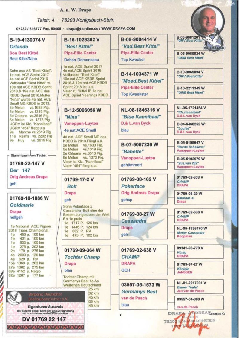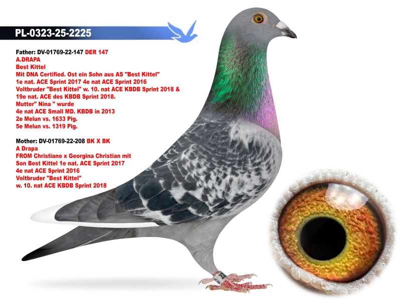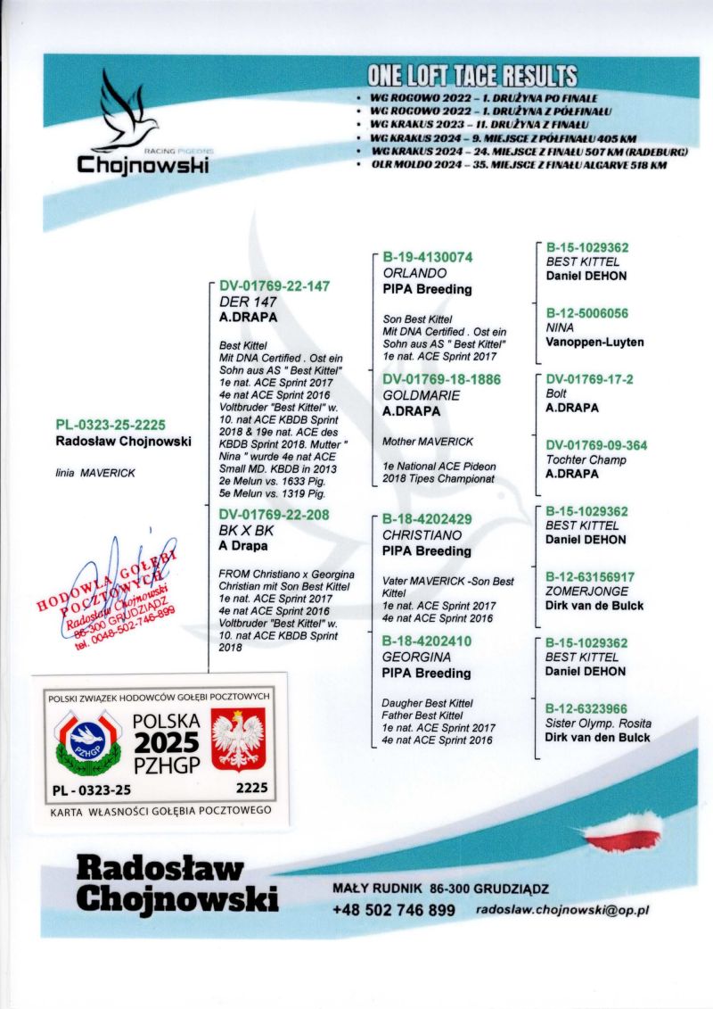 Opis: Ojciec oferowanego gołębia to półbrat MAVERICK, matka pół siostra MAVERICK złotego medalisty z hodowli A. Drapa. Oferowany gołąb to prawdopodobnie SAMCZYK. Koszt transportu 100 zł .