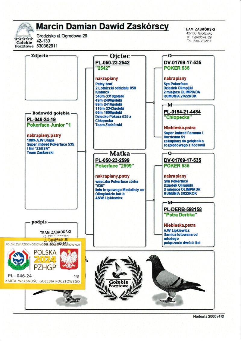 Opis: Gołąb po oryginałach Team Zaskórski zaszczepiony szczepionką "Salmovir". Szczegóły pochodzenia w rodowodzie. Więcej informacji pod nr tel. 724-662-627. Koszt transportu ok. 100-150zł, w przypadku wylicytowania przez jedną osobę minimum 5ciu gołębi transport GRATIS. Możliwość odbioru na Wystawie Ogólnopolskiej (Sobota).