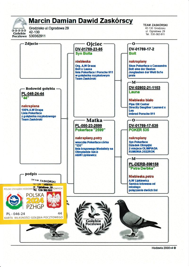 Opis: Gołąb po oryginałach Team Zaskórski zaszczepiony szczepionką "Salmovir". Szczegóły pochodzenia w rodowodzie. Więcej informacji pod nr tel. 724-662-627. Koszt transportu ok. 100-150zł, w przypadku wylicytowania przez jedną osobę minimum 5ciu gołębi transport GRATIS. Możliwość odbioru na Wystawie Ogólnopolskiej (Sobota).